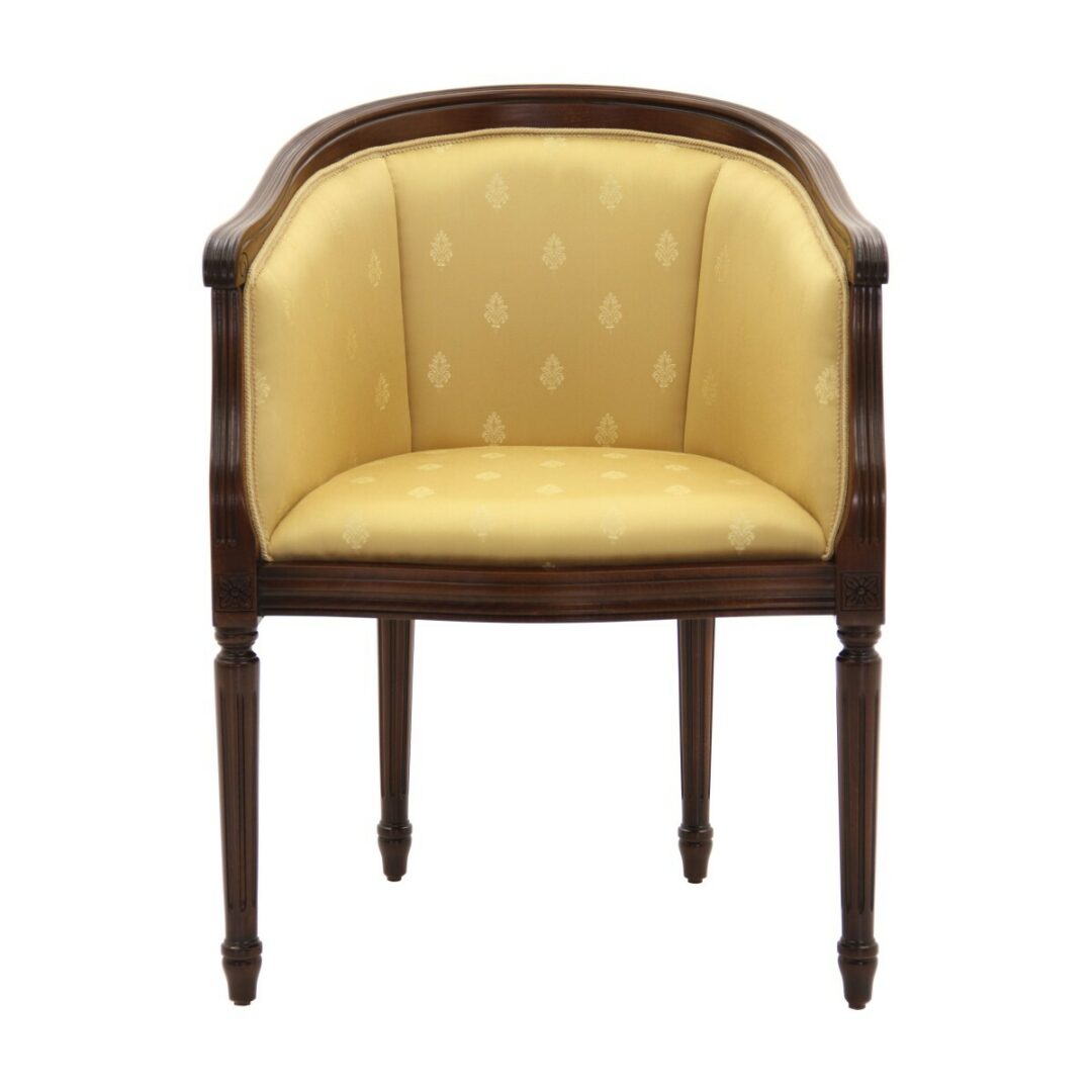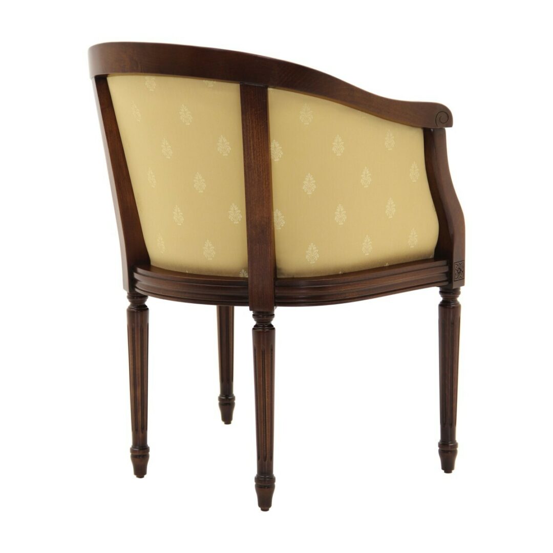 Кресло отличается высокой прочностью благодаря качественному сиденью с пружинами и пенопластом. Резьба на ножках может быть дополнена изящным серебряным или сусальным лаком, а обивка доступна в различных вариантах, включая плетение и двойной рубец.