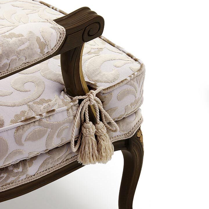 Элегантные линии и изысканные формы кресла LUISA делают его идеальным акцентом для любого роскошного интерьера. Кресло выполнено из прочного букового дерева, что не только обеспечивает его долговечность, но и придает уникальный характер. Две стильные кисточки по бокам подушки сиденья добавляют нотку утонченности, подчеркивая изящество всего изделия.