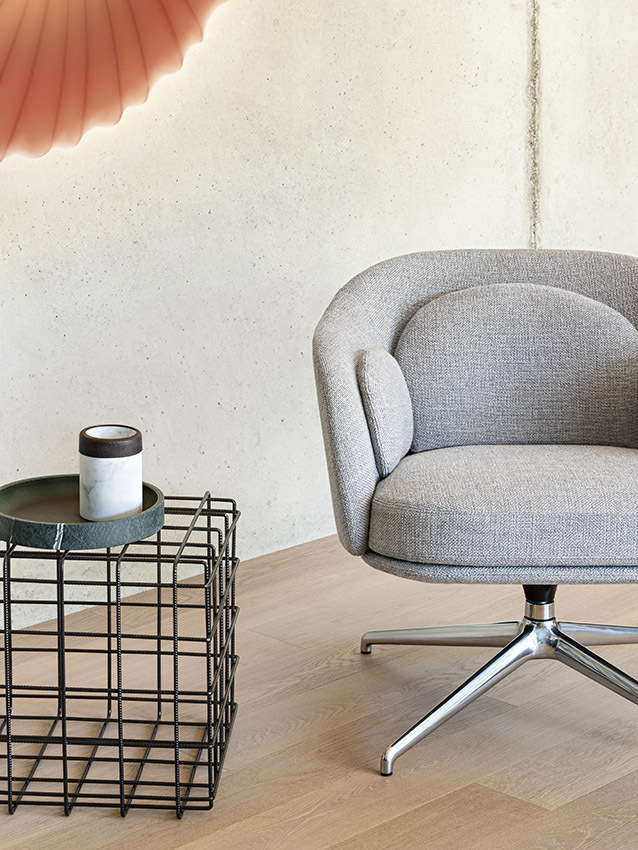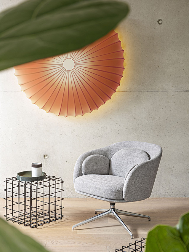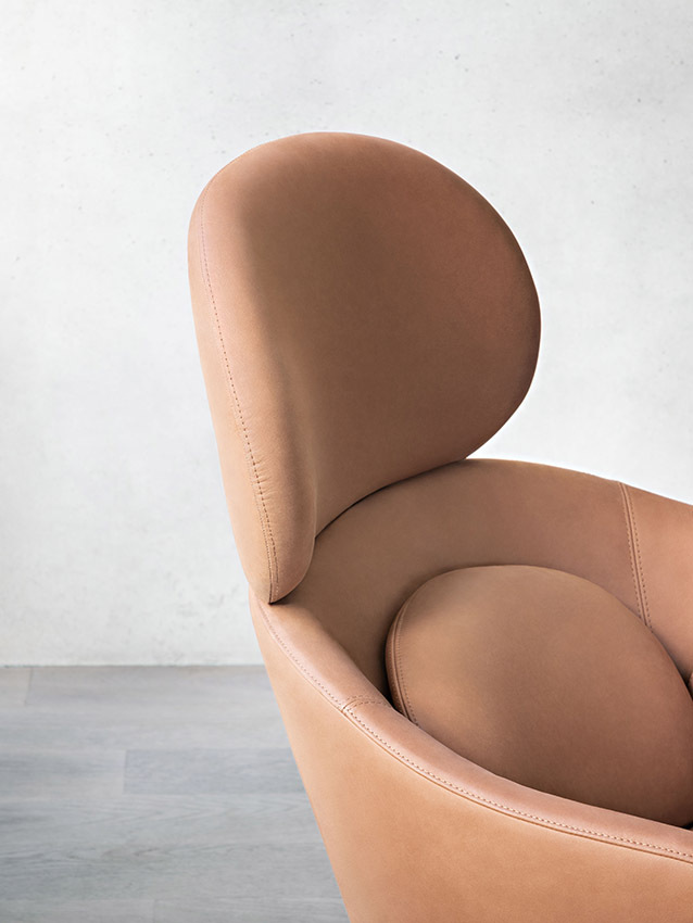 Кресло Sunset отличается уникальным двухчастным дизайном: корпус и подголовник образуют визуально легкий, но выразительный силуэт. Внешняя строгость линий контрастирует с мягкой внутренней обивкой, создавая оригинальный графический эффект. Механизм откидывания (доступный в версии с подголовником) и поворотное основание в форме звезды обеспечивают не только эстетику, но и исключительный комфорт.
