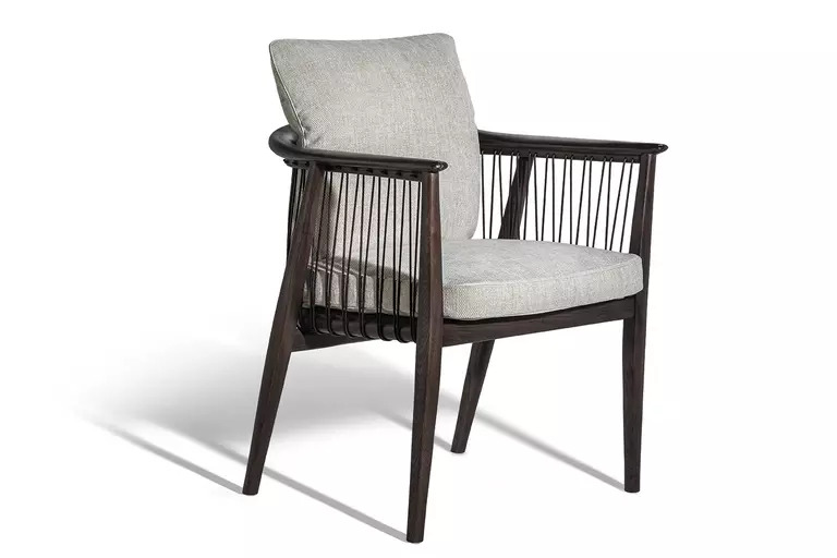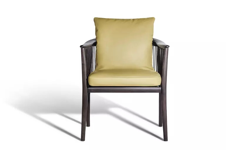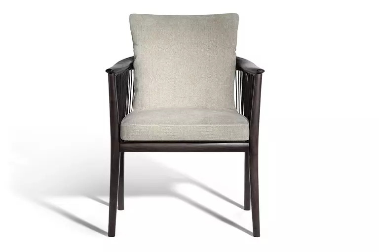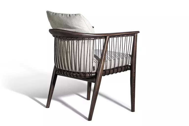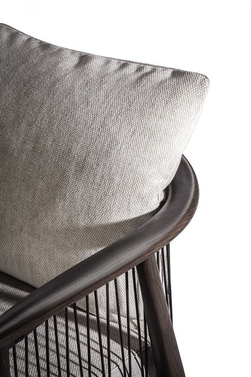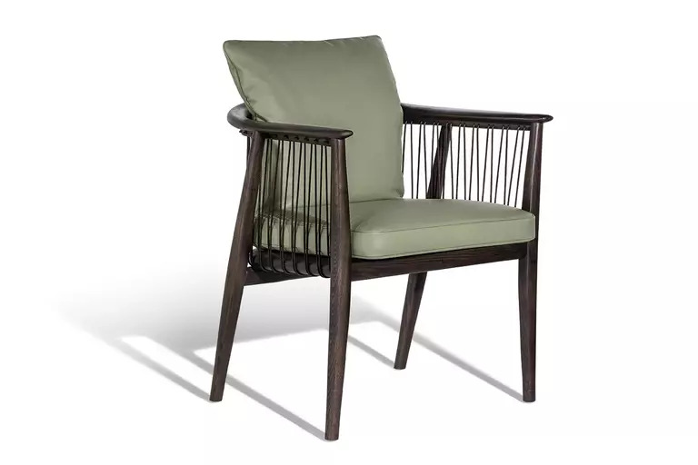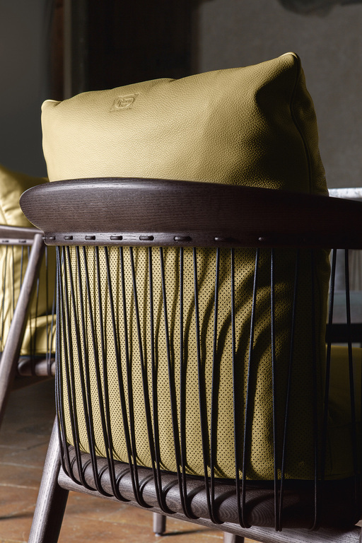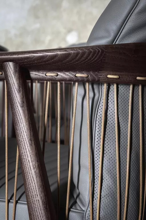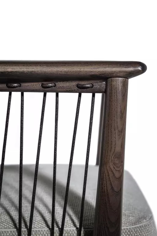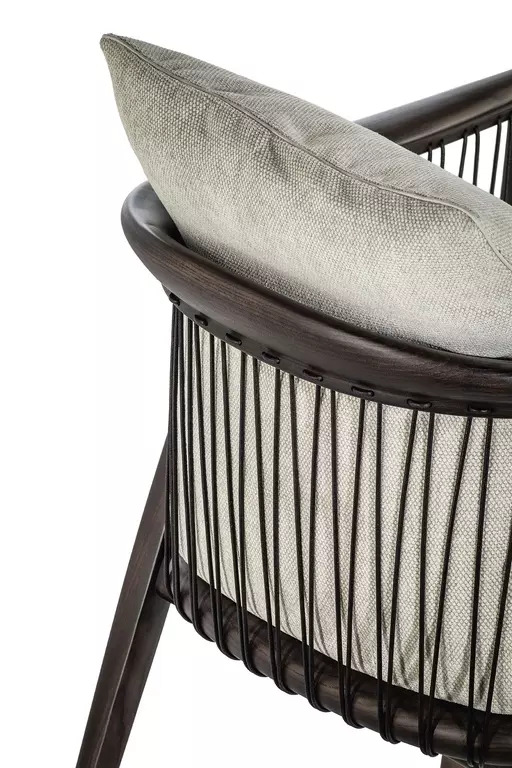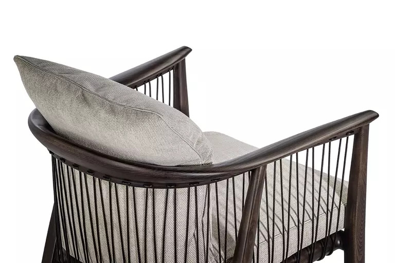 Кресло изготовлено из массива ясеня, доступного в различных отделках — мока или венге, что подчеркивает его благородство. Уникальное переплетение из шнурков из седельной кожи добавляет дополнительный акцент на деталях, делая кресло поистине эксклюзивным. Система рессор сиденья, состоящая из эластичных ремней, обеспечивает идеальную поддержку, а мягкие подушки, заполненные пенополиуретаном и синтепоном, создают атмосферу комфорта.