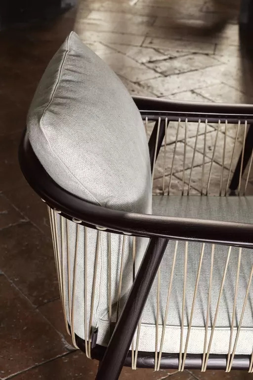 Каркас выполнен из массива ясеня с отделкой в цветах мока или венге, а переплетение из шнурков седельной кожи добавляет эксклюзивности. Мягкие подушки, заполненные пенополиуретаном и пухом, создают атмосферу уюта и расслабления.