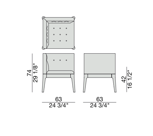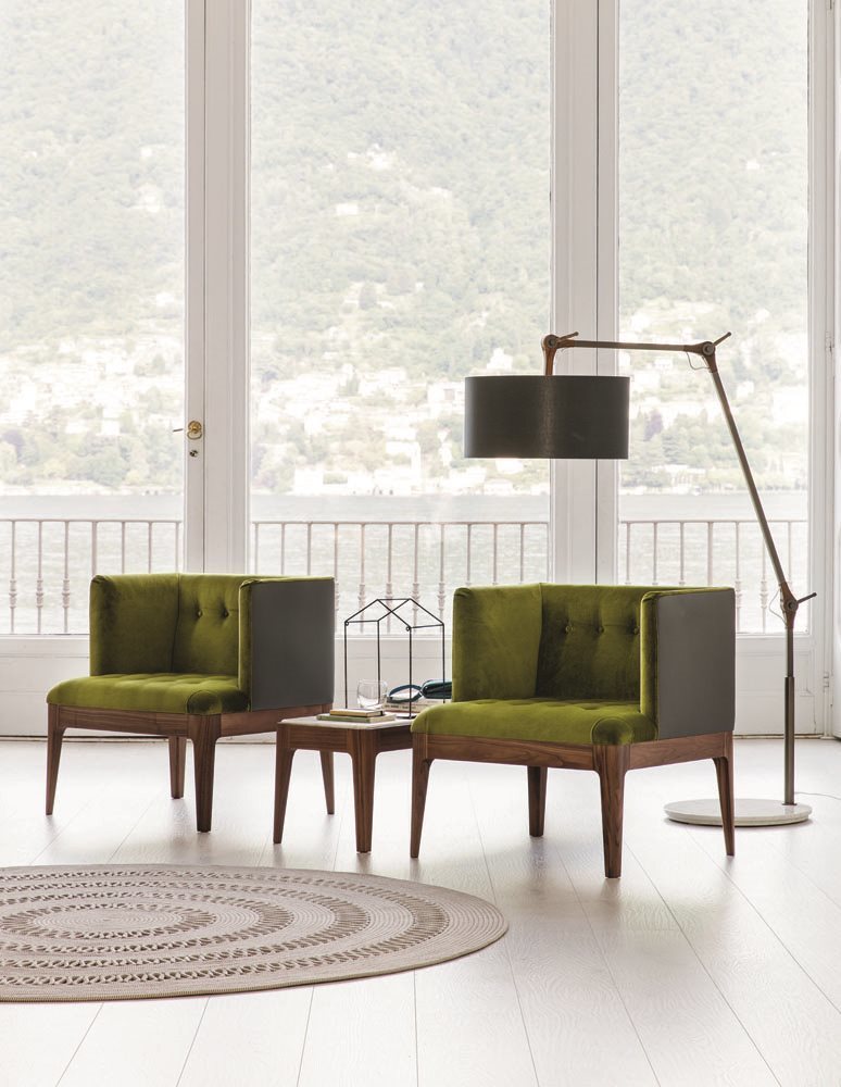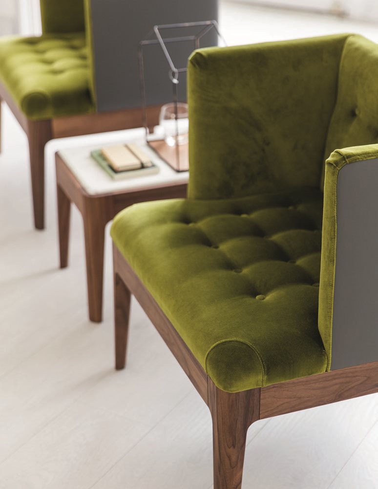 Изготовленное из массива ореха каналетта, это кресло предлагает уникальную отделку капитоне, выполненную из тканей коллекции.
