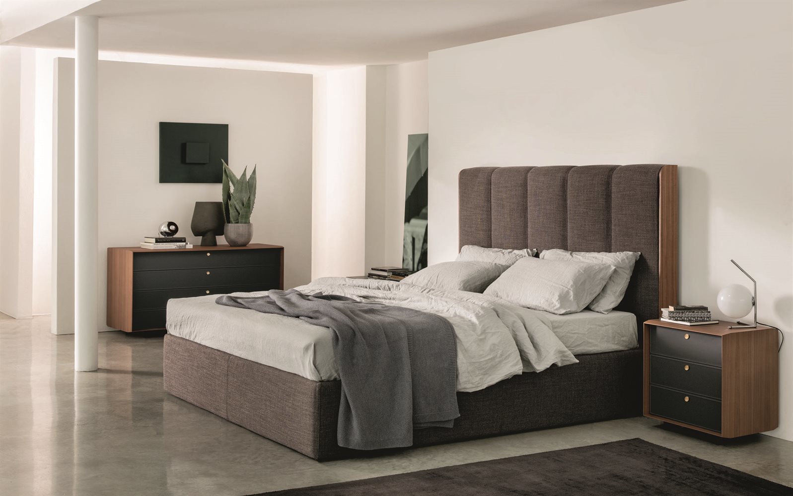 Кровать Aida выделяется своим утонченным дизайном и гармоничными формами. Изголовье, обитое мягкими тканями, создает атмосферу уюта и роскоши, в то время как профиль и цоколь, выполненные из благородного ореха каналетта, добавляют статусности и элегантности. Каждая деталь кровати продумана до мелочей, что делает её идеальным акцентом для вашего спальня.