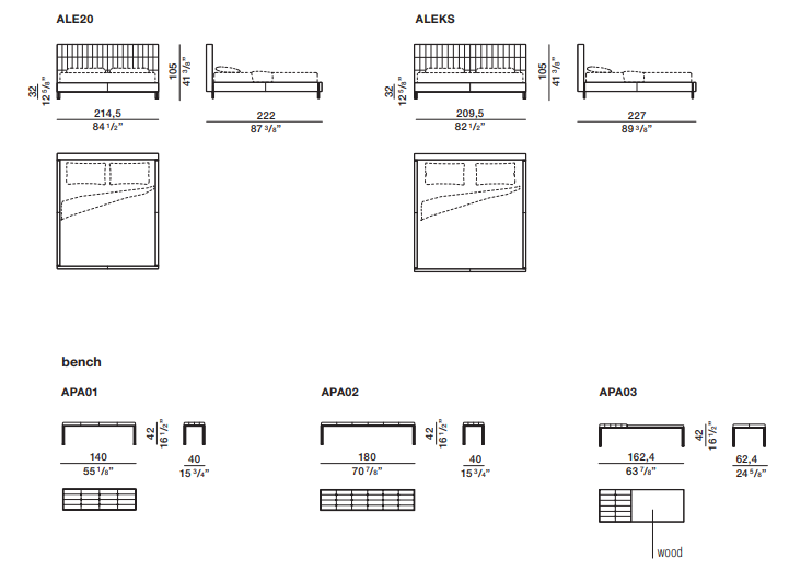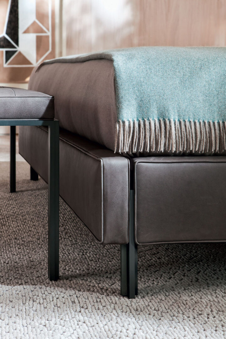 Изголовье с капитоне в современной интерпретации подчеркивает объем, а ножки с оловянной отделкой добавляют благородства. Доступна в различных вариантах обивки — от кожи до текстиля, причем все элементы съемные для удобства ухода. Идеально сочетается со скамейкой в аналогичном исполнении.