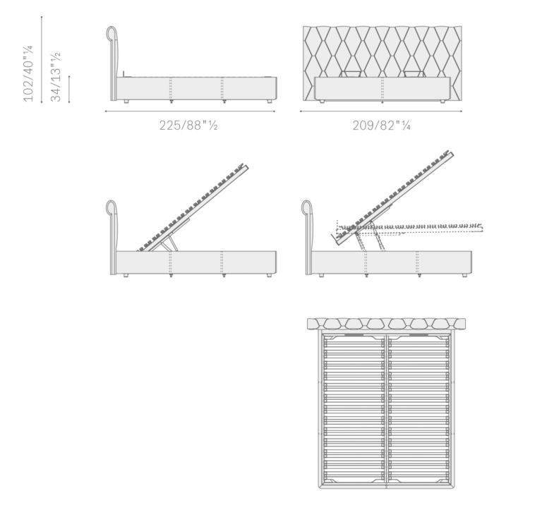 Одним из выдающихся преимуществ кровати Bluemoon является ее вместительный шкаф для хранения, который удобно расположен в изножье. Доступ к нему осуществляется с помощью газовых пружин, что делает его использование простым и удобным. Кроме того, передняя часть основания имеет ножки из бука с текстурированной черной отделкой, а со стороны изголовья расположены колесики, облегчающие перемещение кровати.