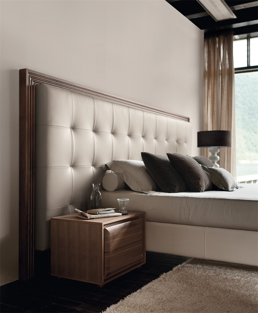 Изголовье кровати выполнено из массива дерева и обито высококачественными тканями с декоративной строчкой прямоугольной формы, что придаёт ей изысканный вид.