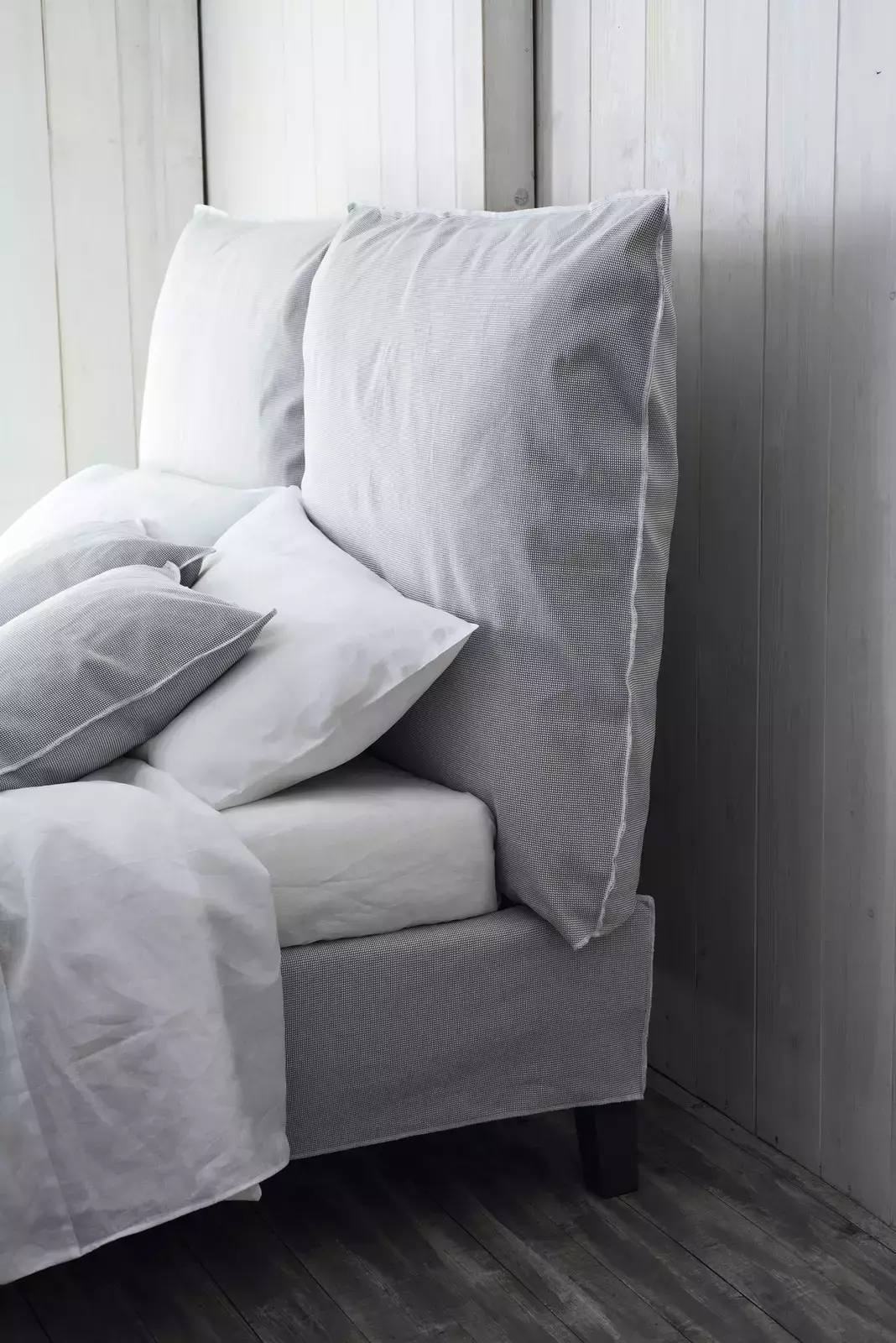 Итальянская кровать Fly Collection Beds от фабрики Gervasoni сочетает элегантность и комфорт. Модель с большим изголовьем из двух подушек создает уютную атмосферу. Съемный чехол и каркас обеспечивают практичность, а текстильная структура гармонично сочетается с деревянными ножками, скрытыми тканевой юбкой.