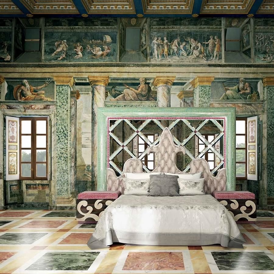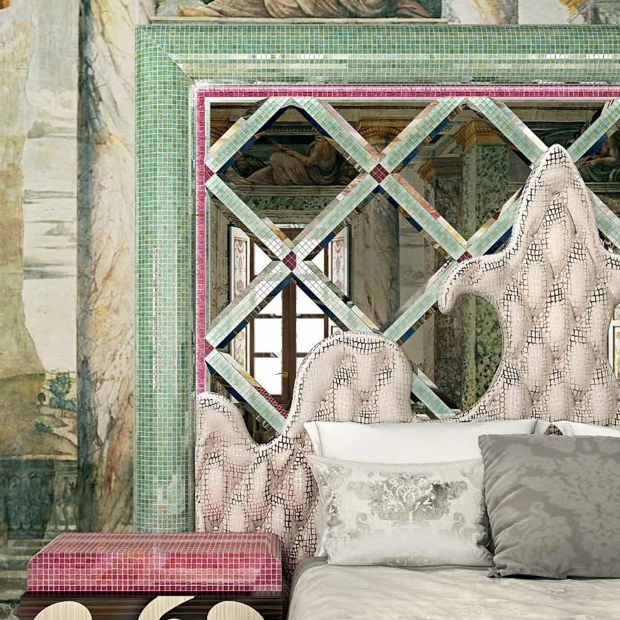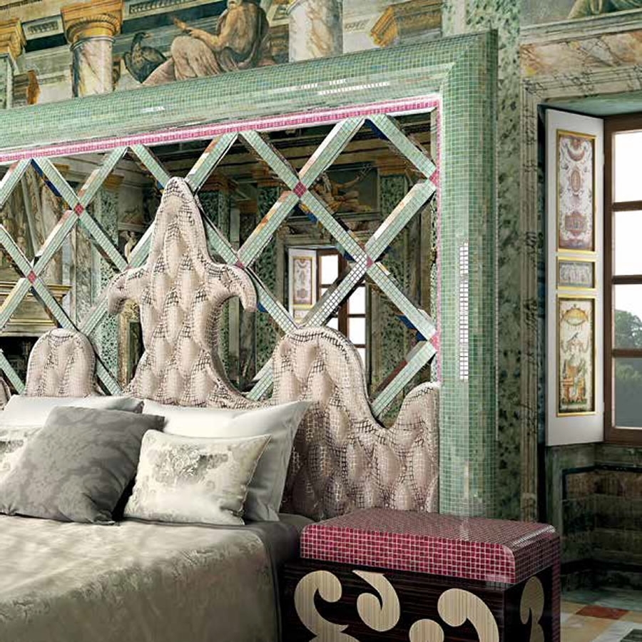 Изголовье, облицованное мозаикой Sicis и скошенными зеркалами, визуально расширяет пространство, а отделка капитоне добавляет мягкости. Наполнитель из пенополиуретана и защитная дублированная ткань гарантируют комфортный сон.