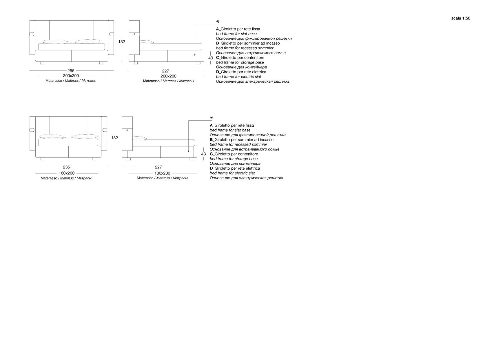 Кровать предлагает разнообразие оснований: от неподвижного с регулируемыми рейками до практичного контейнера для хранения. Также доступны модели с электроприводом и дистанционным управлением. Обивка из кожи и ткани несъемная, что подчеркивает премиальный характер изделия.