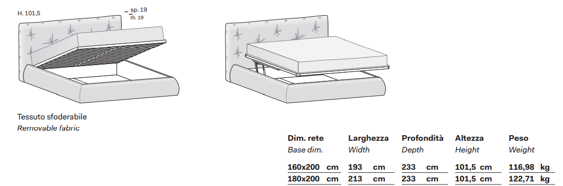 Кровать MODO от итальянской фабрики NOVAMOBILI – воплощение мягкой элегантности с большим изголовьем и изысканным тафтингом без пуговиц. Округлое мягкое основание доступно в варианте с функцией хранения: механизм позволяет приподнимать матрас для удобства заправки. Итальянское качество и продуманный дизайн делают эту модель стильным и практичным решением для спальни.