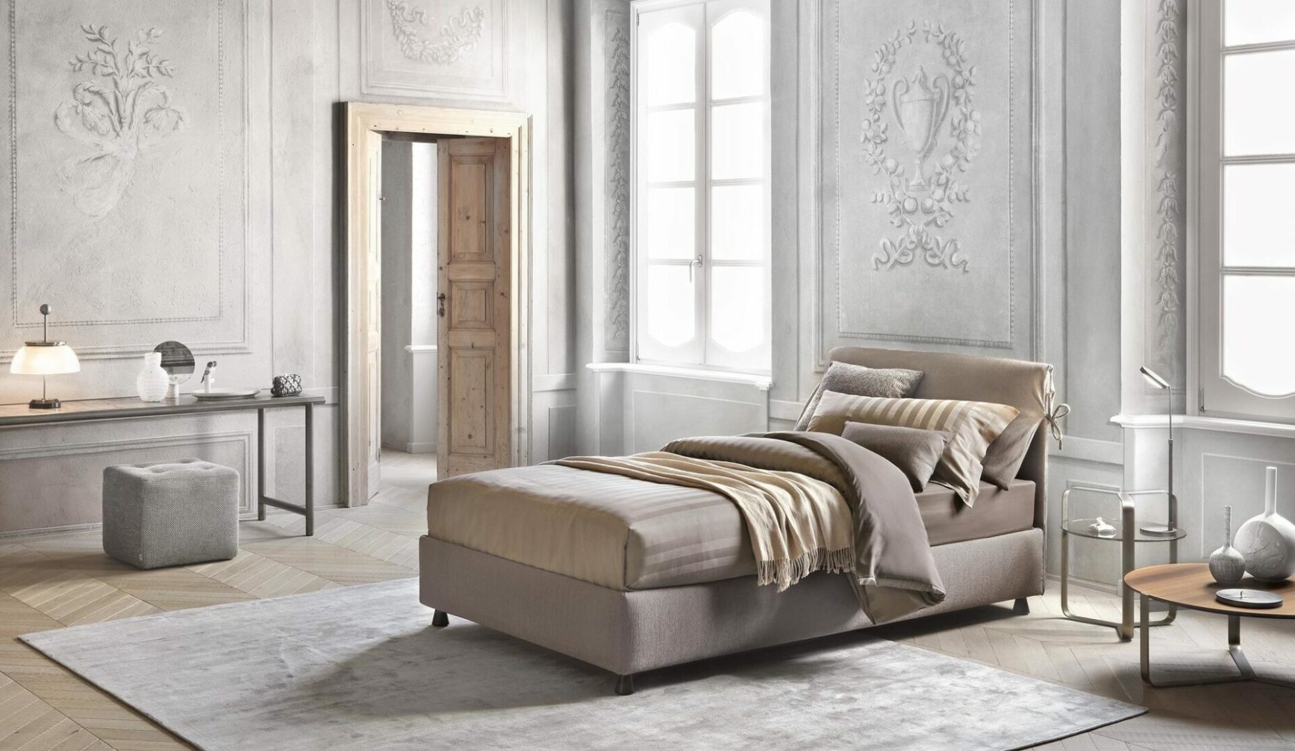 Кровать Nathalie от итальянской фабрики FLOU — это воплощение утонченного стиля и качества, ставшее настоящим произведением искусства. Мягкое изголовье с элегантными бантиками не только привлекает внимание, но и позволяет удобно хранить подушки, защищая их от пыли.