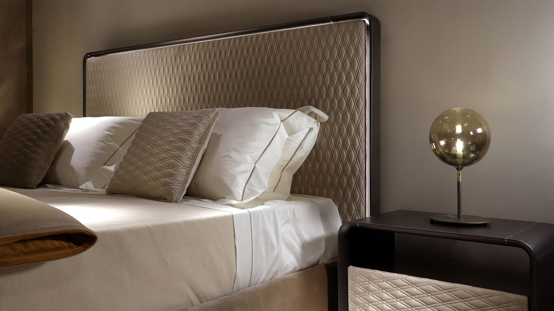 Кровать OH от итальянской фабрики REFLEXANGELO сочетает в себе элегантный дизайн и современные технологии. Модель с рамой из бронзы, латуни, темной латуни или титана дополнена светодиодной подсветкой и сенсорным выключателем. Мягкое изголовье, обтянутое кожей или тканью, можно персонализировать, выбрав желаемый стеганый узор.