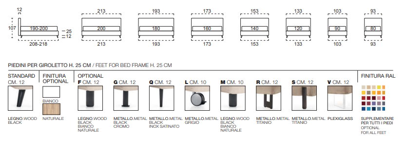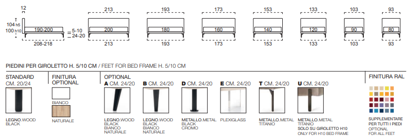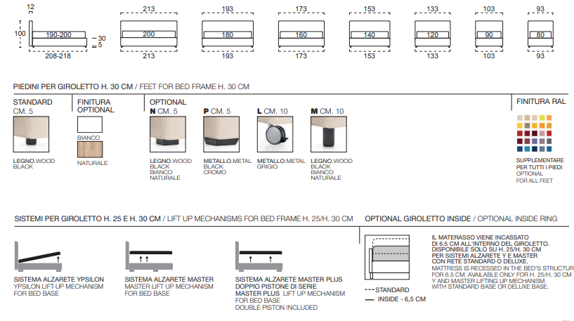 Кровать доступна в трёх ширинах и трёх высотах основания; высота подъёмного механизма — четыре варианта, от 5 до 30 см; механизм может опустить решётку на 65 см.