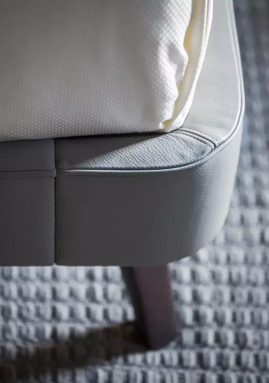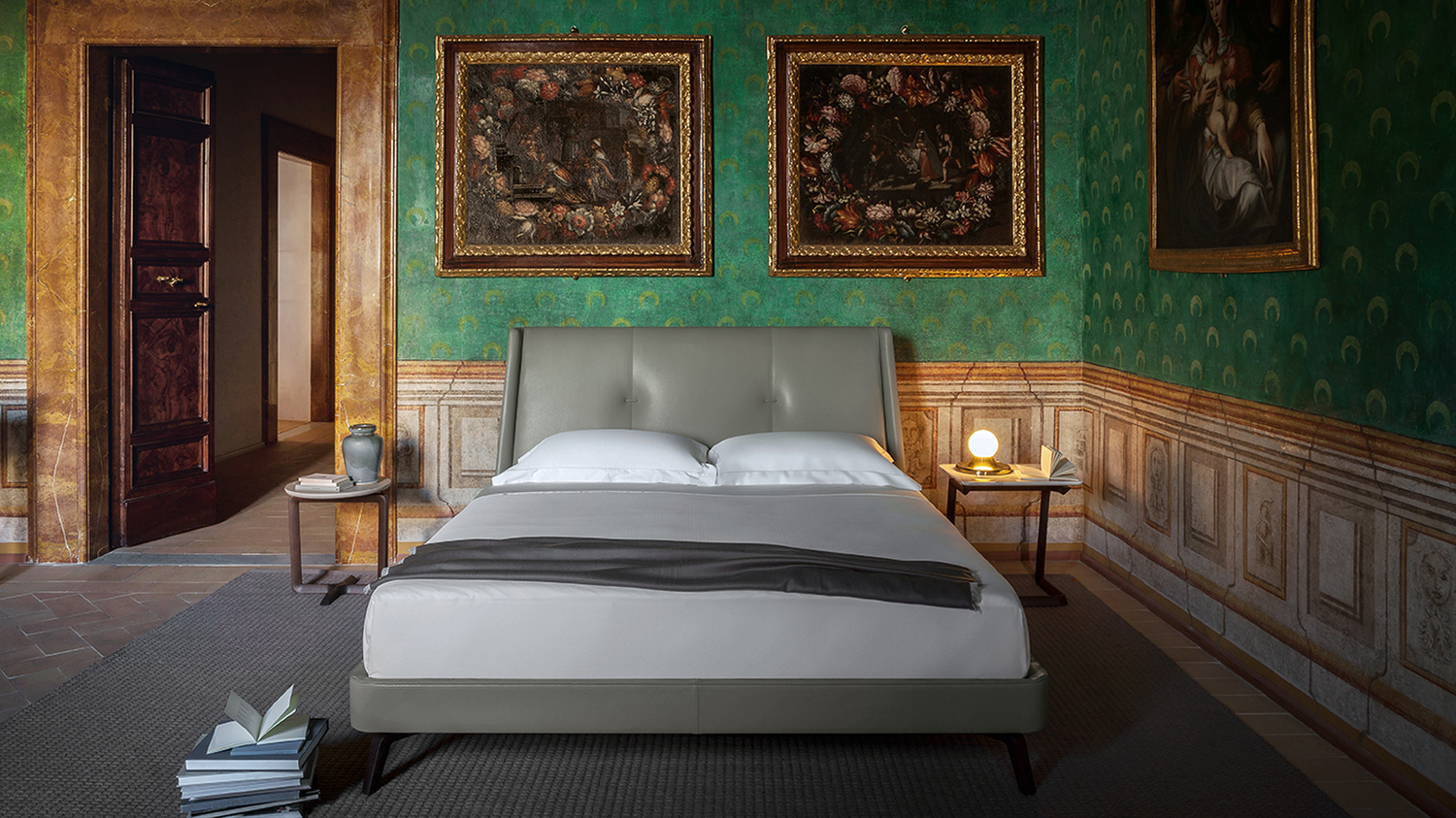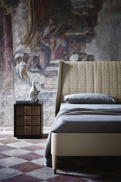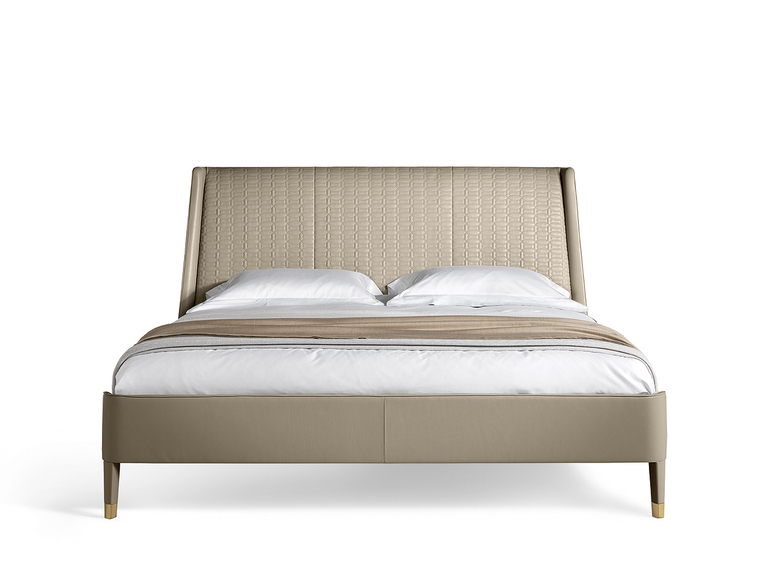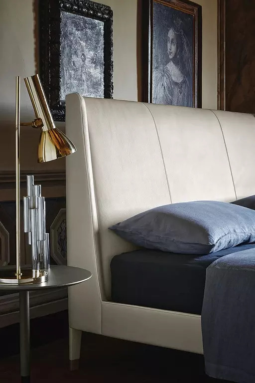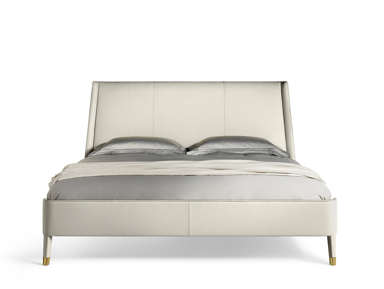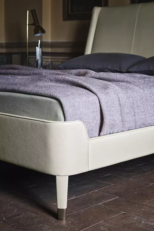 Кровать изготовлена из массива буковой и березовой фанеры, а обивка выполнена из кожи Pelle Frau® — символа итальянского качества. Использование пенополиуретана обеспечивает не только комфорт, но и долговечность. Конические ножки, обтянутые кожей или выполненные из твердого ясеня, добавляют изящества и практичности.