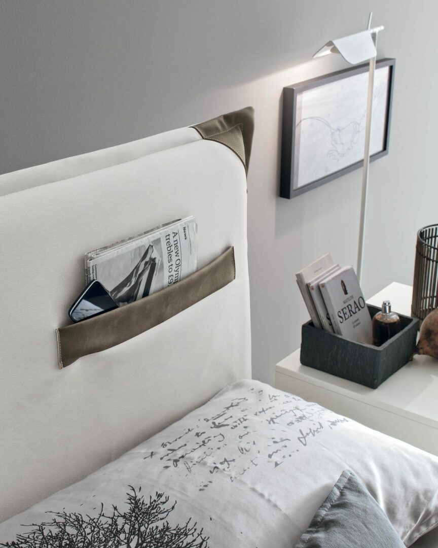 Элегантные линии и современные формы кровати Tasca Ring 60 делают её настоящим произведением искусства. Изголовье, оформленное двумя накладными карманами, не только добавляет оригинальности, но и служит практичным решением для хранения любимых журналов или мелочей. Вставки из экокожи или искусственного нубука придают этой кровати особую изысканность, гармонично сочетаясь с любым интерьером.