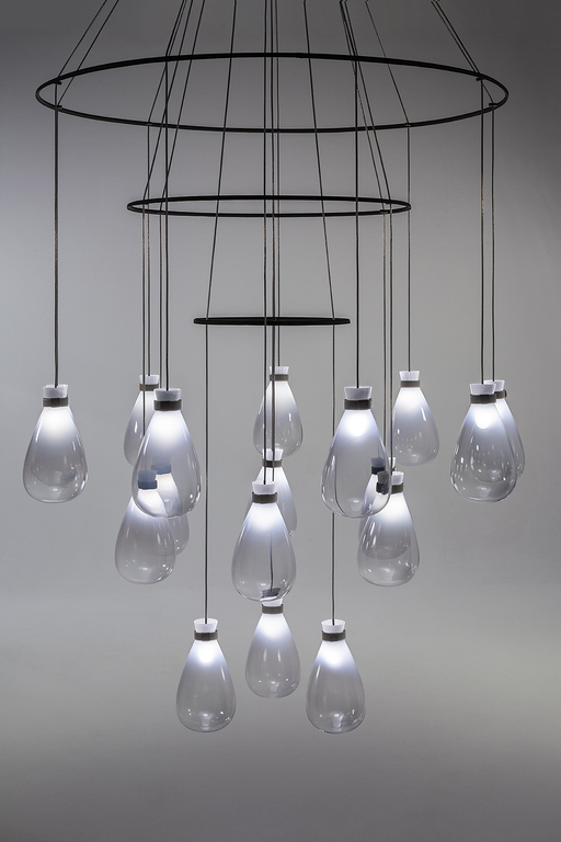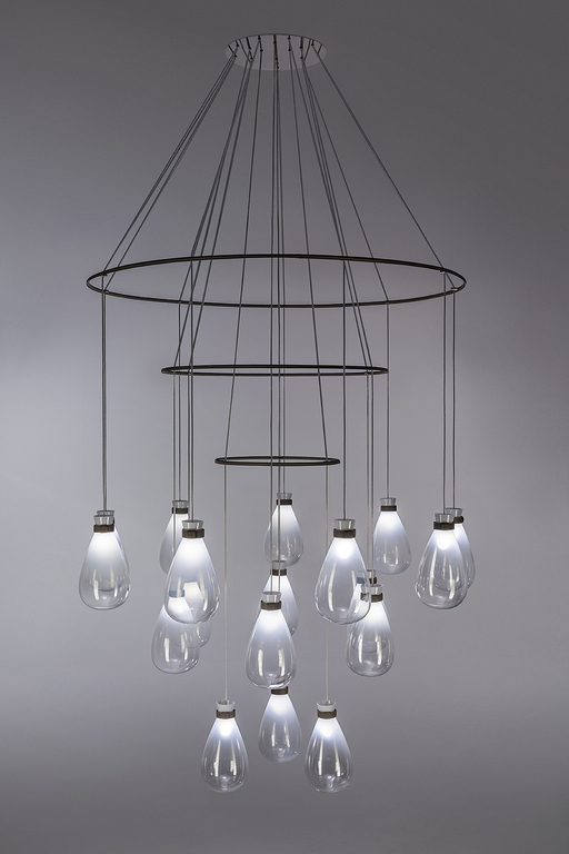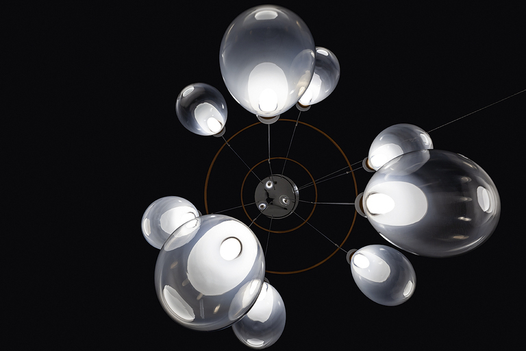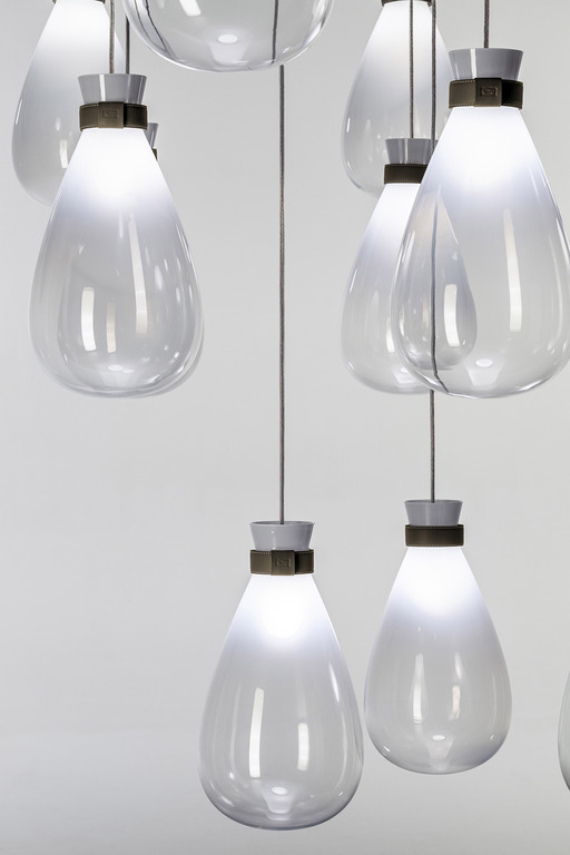 Люстра Soffi состоит из двух элементов, выполненных из выдувного стекла. Внешний шар, играющий с молочно-белыми и дымчато-серыми оттенками, кажется легким и почти невесомым. Внутренний светильник из матового белого стекла с жемчужной отделкой придаёт люстре прочность и изящество. Свет, излучаемый лампой, нежно рассеивается, подчеркивая утончённость внешнего стекла и его тонкую прозрачность.