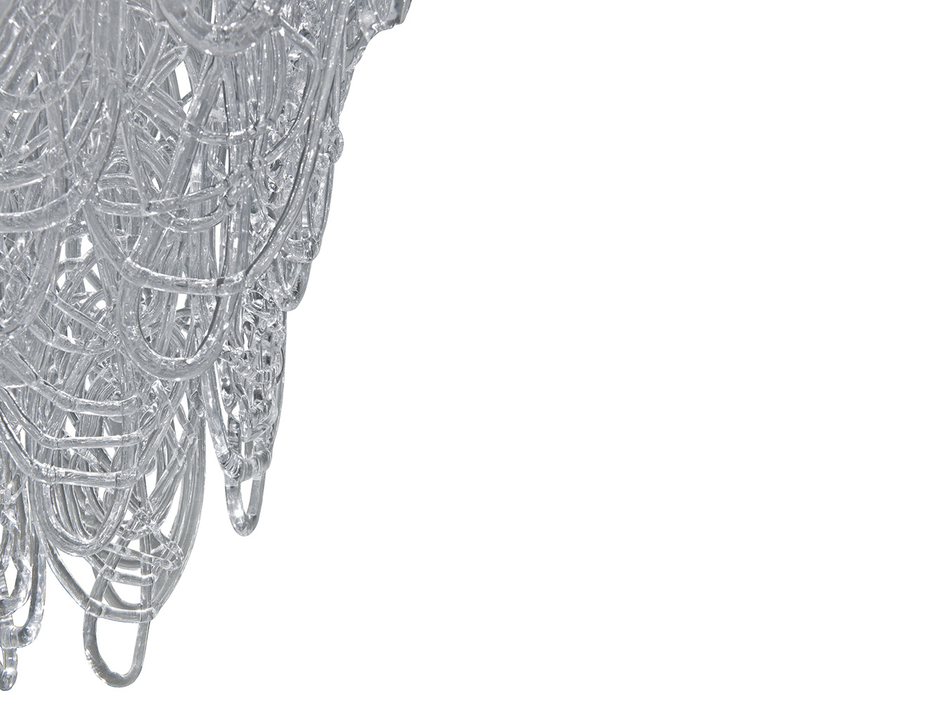 Люстра обладает уникальным коническим дизайном из каскада стеклянных элементов, создающих эффект легкости. Металлическая структура служит надежной основой, а высококачественное художественное стекло добавляет выразительности.