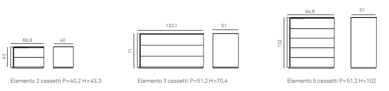 Большая тумбочка с 2 ящиками: ширина 66,8 см, глубина 40,2 см, высота 43,3 см. Комод с 3 ящиками: ширина 133,1 см, глубина 51,2 см, высота 70,4 см. Комод с 5 ящиками: ширина 94,8 см, глубина 51,2 см, высота 102,1 см.