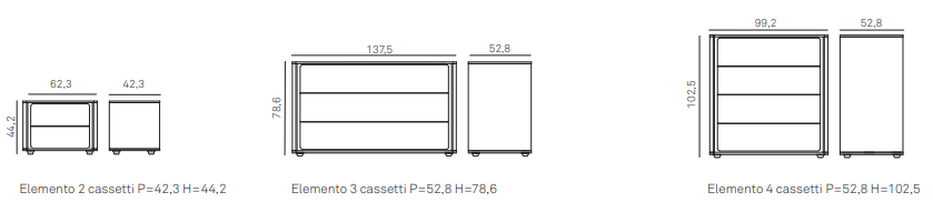 Тумбочка имеет ширину 62,3 см. Комоды имеют ширины 137,5 см и 99,2 см.