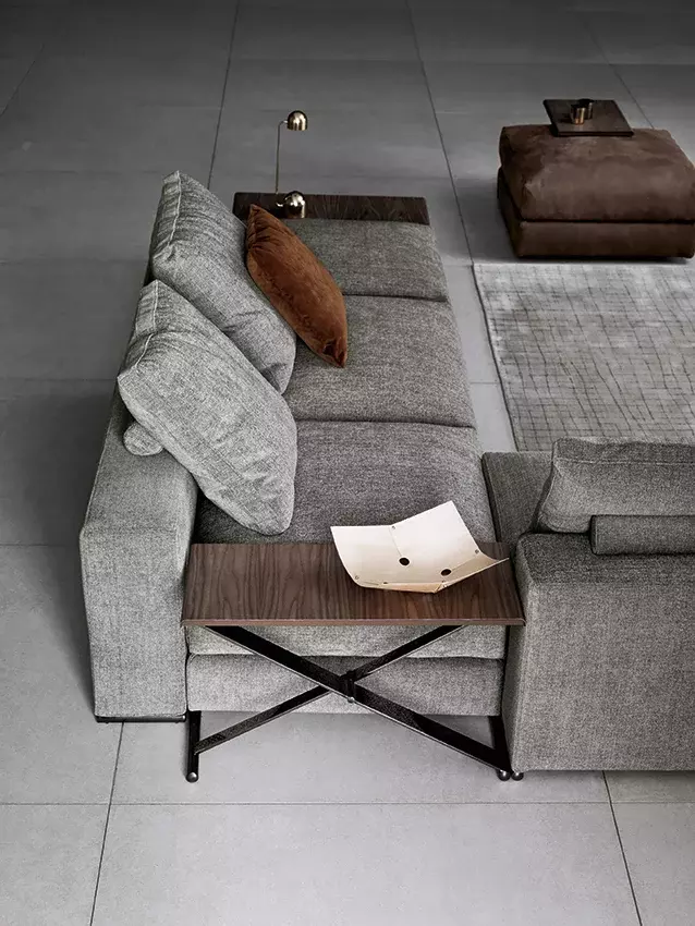 Дополнительный штрих — приставной столик с хромированной основой и столешницей из шпона грецкого ореха или регенерированной кожи, подчеркивающий статусность мебели.