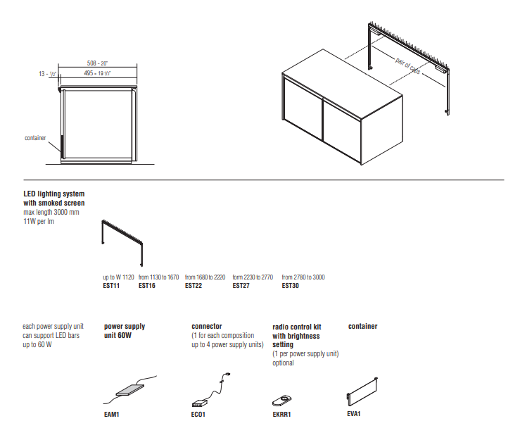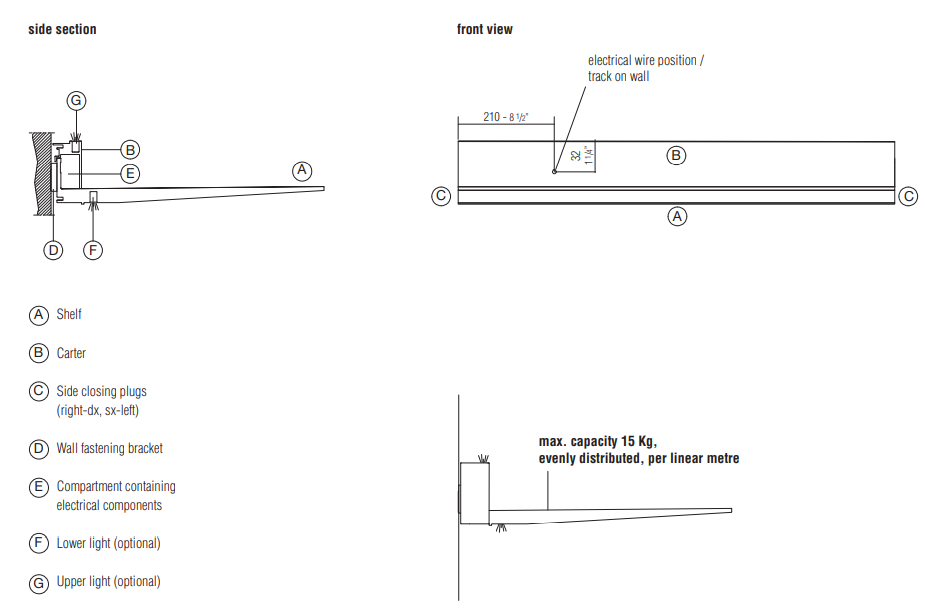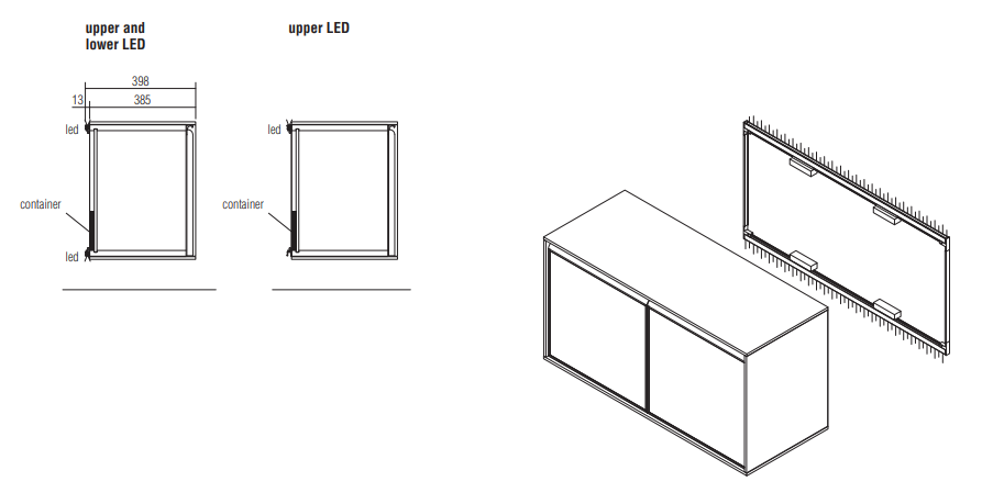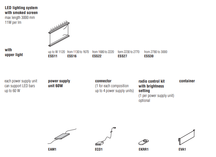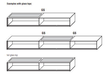 Особенности: копчёное стекло для эксклюзивных витрин, светодиодная подсветка по периметру с регулировкой интенсивности, закруглённые фасады и деревянные ящики с металлическими ручками. Интерьер с отделкой под кедр и меламином в благородных оттенках. Вертикальные стеклянные блоки с подсветкой идеальны для демонстрации коллекций.