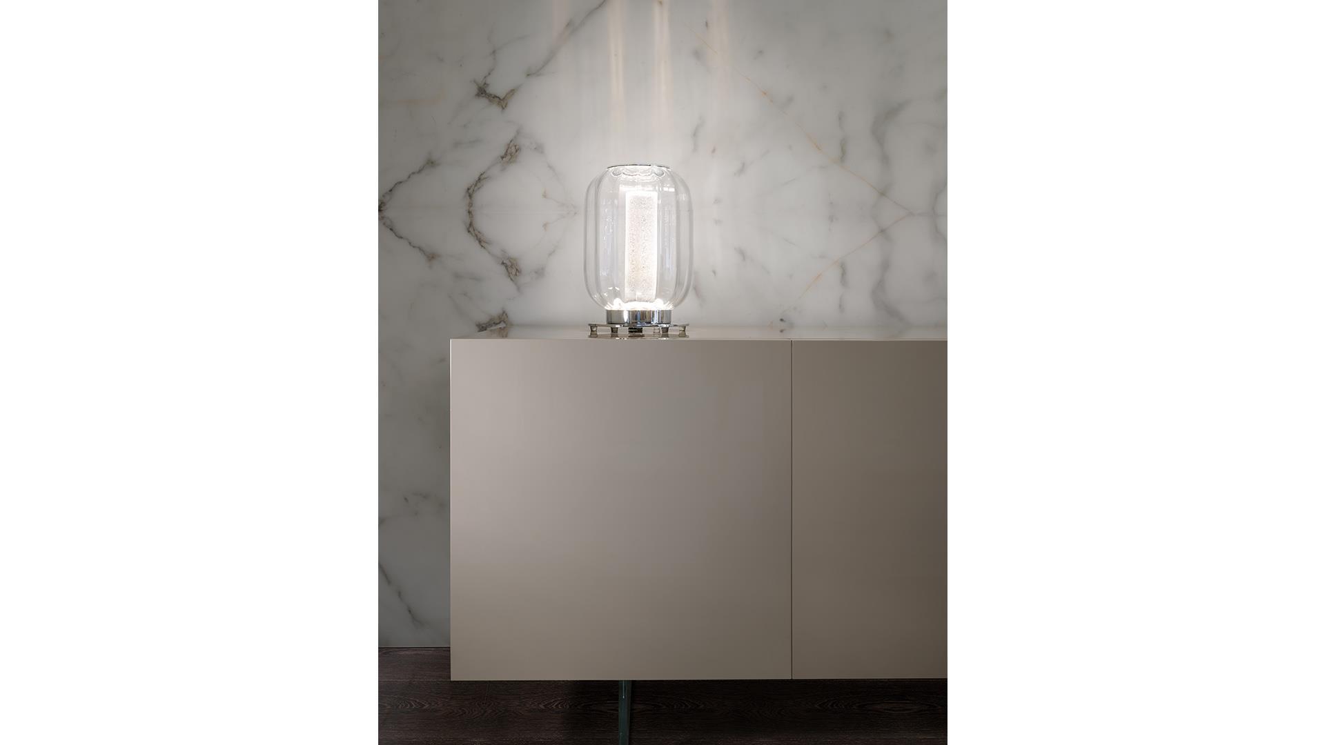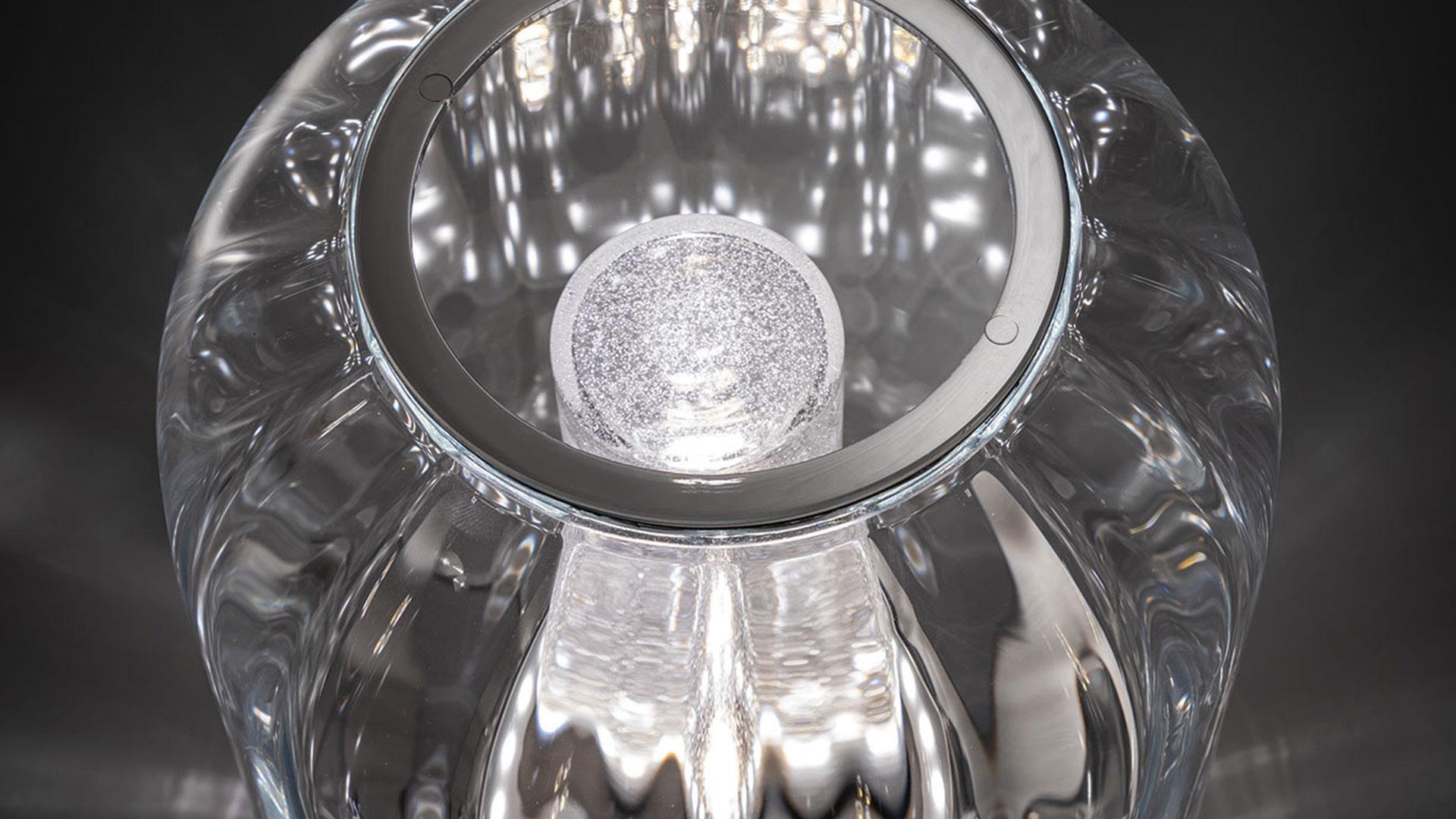 Настольная лампа LANTERNA от итальянской фабрики REFLEXANGELO — элегантное сочетание художественного стекла и современных технологий. Доступна в благородных цветах: прозрачная, аквамарин и янтарь. Уникальный внутренний диффузор создает эффект росы, а полированная хромированная основа подчеркивает премиальный статус изделия.