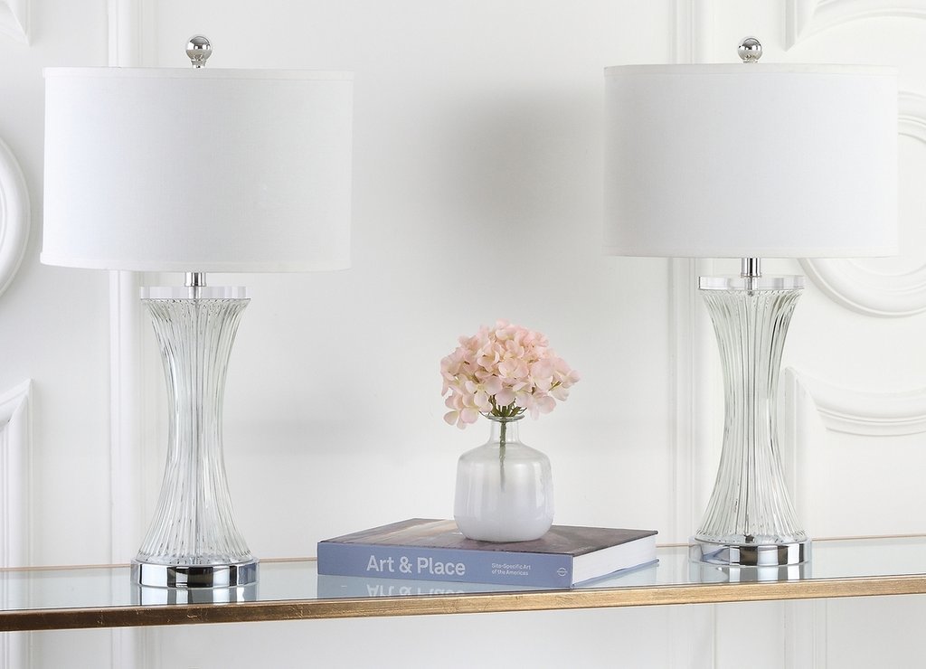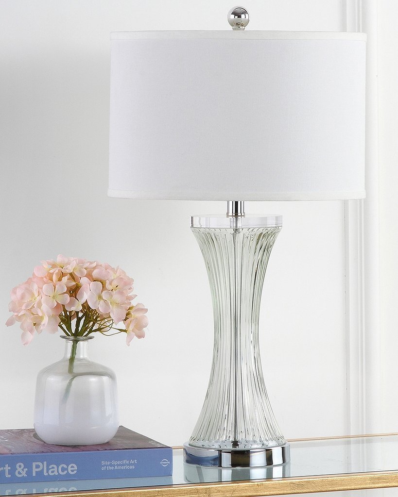 Настольная лампа NAOMI от фабрики LOUVREHOME – элегантное сочетание современного дизайна и функциональности. Рифлёное хрустальное основание в форме песочных часов, белый цилиндрический абажур и хромированные металлические детали создают утончённый стиль.