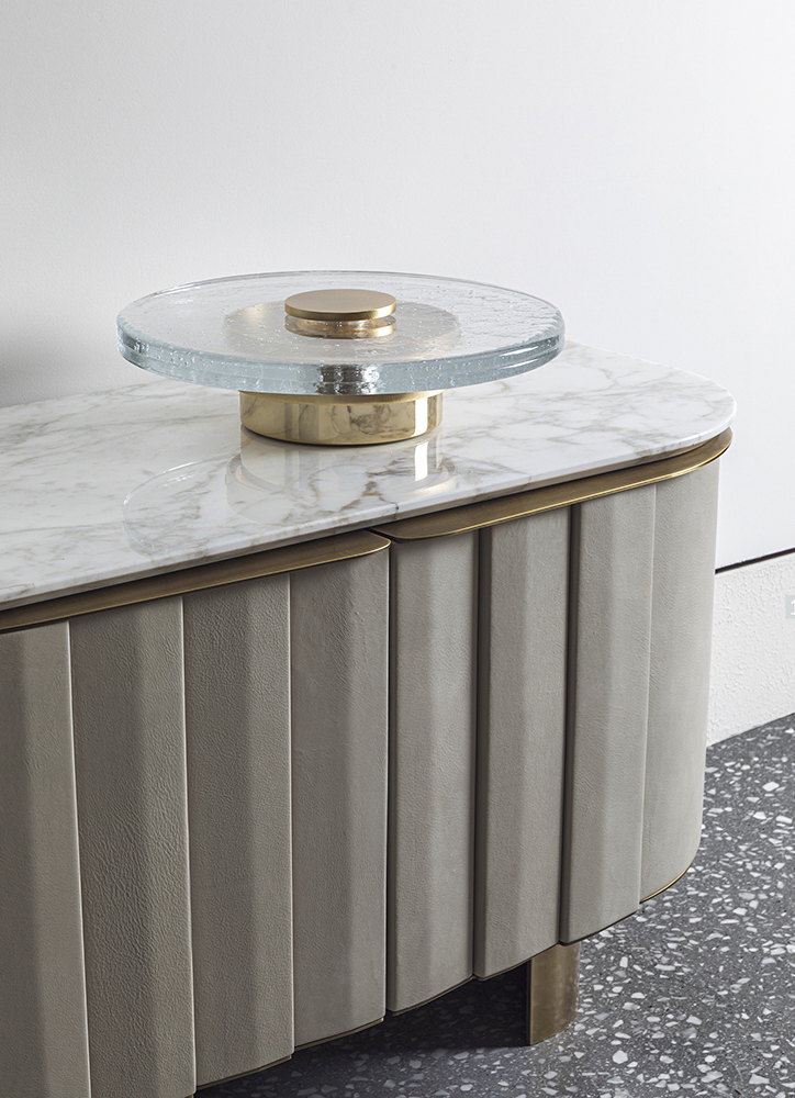 Лампа Saturn выполнена на цилиндрической основе из матового металла, что придает ей современный вид и стабильность. Основным элементом является стеклянный диск, выполненный по уникальной технике pulegoso, которая произошла в начале XX века. Это стекло, полное пузырьков воздуха, создается вручную, и каждое изделие становится уникальным. Дизайнер вдохновился этой техникой, чтобы подчеркнуть необычную красоту стеклянной поверхности, через которую мягко рассеивается свет, создавая атмосферу уюта и тепла.