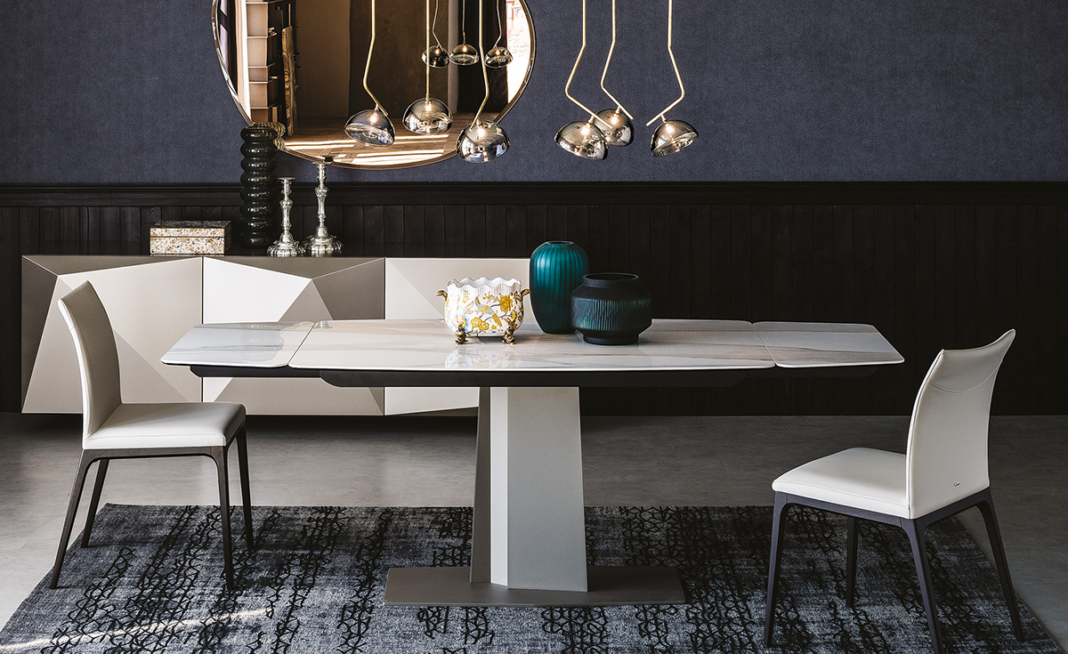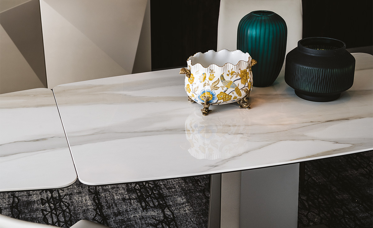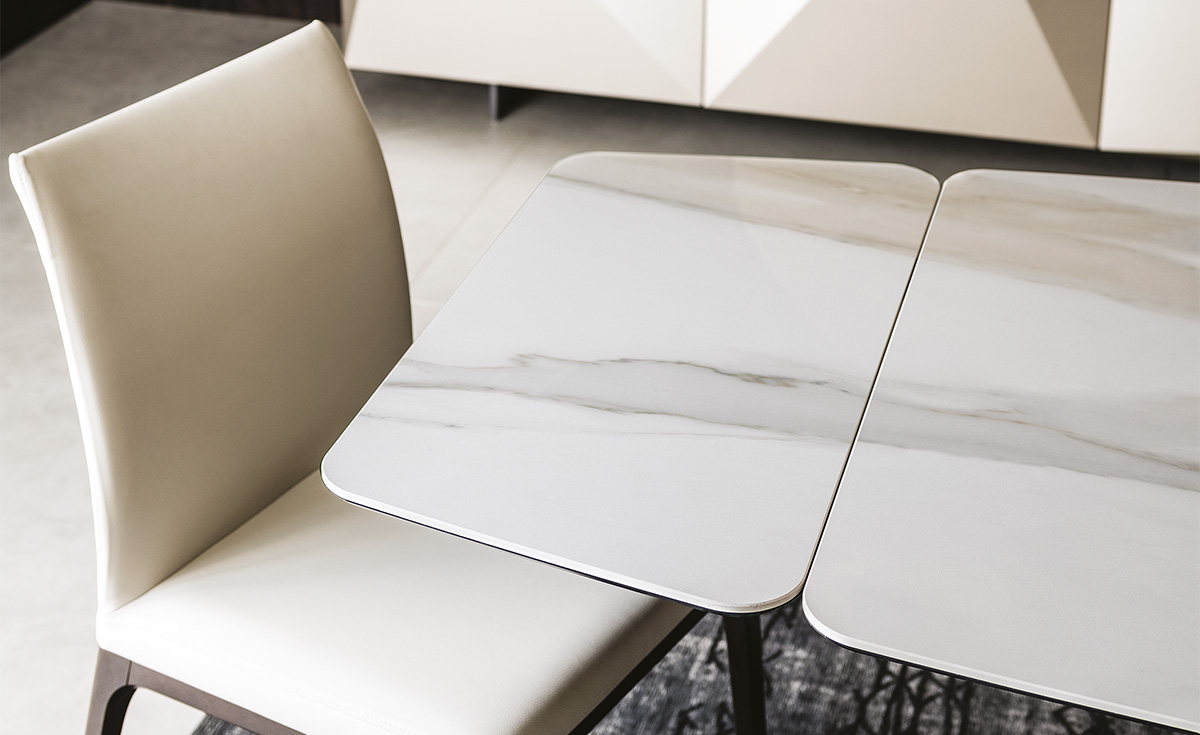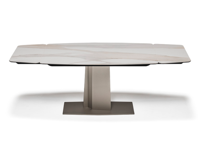 Этот раздвижной стол сочетает в себе элегантность и функциональность, позволяя легко адаптироваться под любые события. База из стали доступна в трех отделках: гофрированный титан, графит и черный. Столешница выполнена из керамики под мрамор и предлагает множество цветовых решений, включая Calacatta, Alabastro и матовый Golden Calacatta.