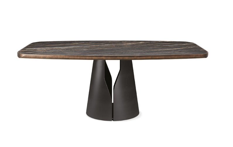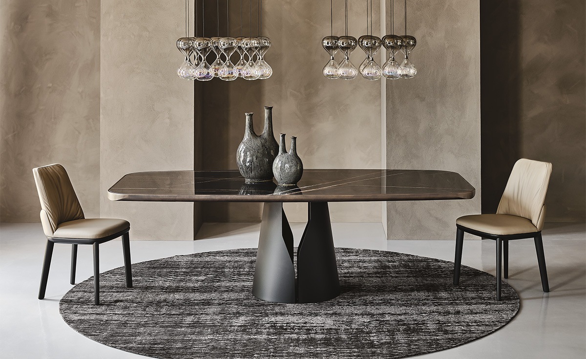 Керамический верх представлен в широком ассортименте отделок, включая Calacatta и Portoro. Доступные размеры 160×160 см, 200×120 см и 240×120 см обеспечивают идеальную посадку для любой столовой.