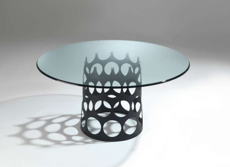 Этот стильный обеденный стол отличается прочным металлическим основанием и элегантной столешницей, выполненной из высококачественного хрусталя, мрамора или массива ореха каналетта толщиной 15 мм.