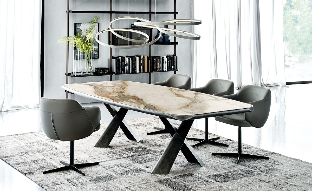 Обеденный стол Mad Max Keramik Premium от итальянской фабрики Cattelan Italia – воплощение роскоши и функциональности. Основание выполнено из титана, бронзы, графита или лакированной стали в различных оттенках. Столешница доступна в керамике премиальных сортов: Marmo Calacatta, Alabastro, Ardesia и других, а также в дереве толщиной 5-6 см. Закругленные профиля и продуманные детали подчеркивают итальянское качество. Идеальный выбор для тех, кто ценит элегантность и долговечность.