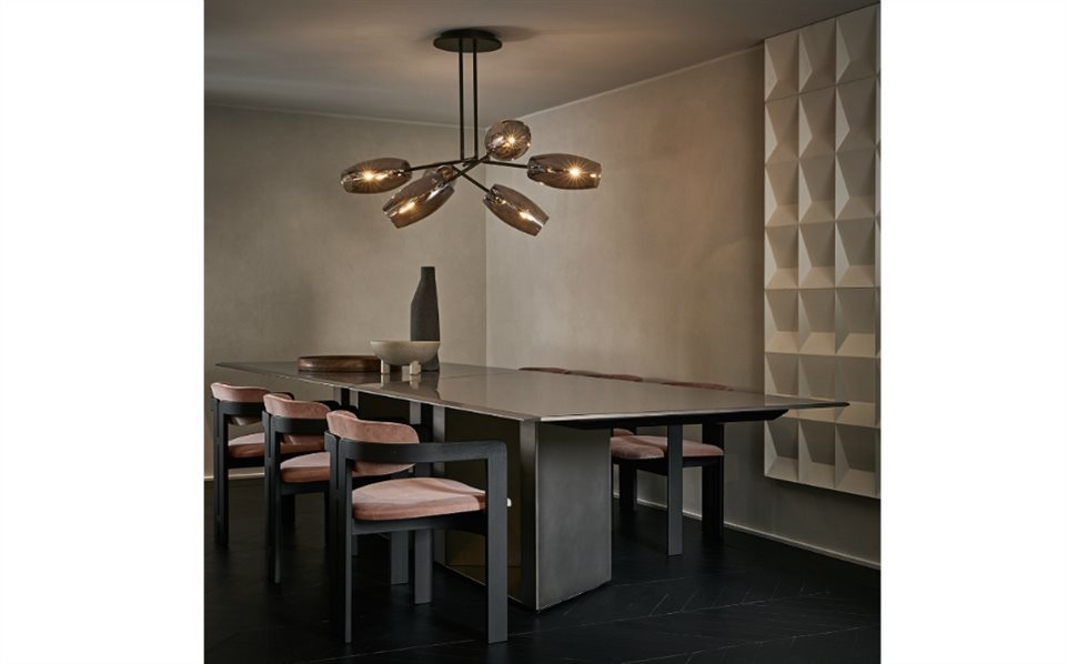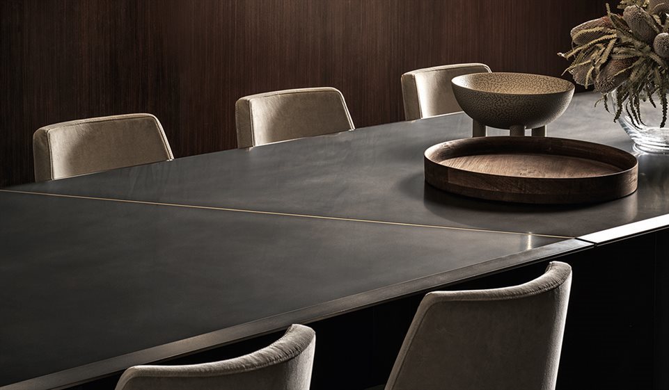 Стол Platium System обладает модульной стеклянной столешницей толщиной 15 мм, которая придает ему легкость и элегантность. Деревянное основание, покрытое 6-миллиметровым стеклом ручной работы, дополнено эксклюзивным декором из античной бронзы и свинца. Важный скос 4 см с двух сторон верхней части стола делает его не только стильным, но и функциональным, а деталь соединения столешниц из атласной латуни добавляет нотку роскоши.