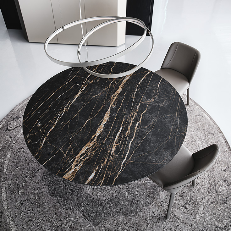 Стол Yoda Keramik поражает своим авторским дизайном, который сочетает в себе утонченность и современность. База из стали, доступная в нескольких изысканных цветах: гофрированном графите, белом и черном, идеально контрастирует с верхом из керамики, имитирующей мрамор. Выбор отделки топа впечатляет: матовые и глянцевые варианты, такие как Golden Calacatta, Portoro, Sahara Noir и Emperador, позволят вам создать индивидуальный стиль, соответствующий вашим предпочтениям.