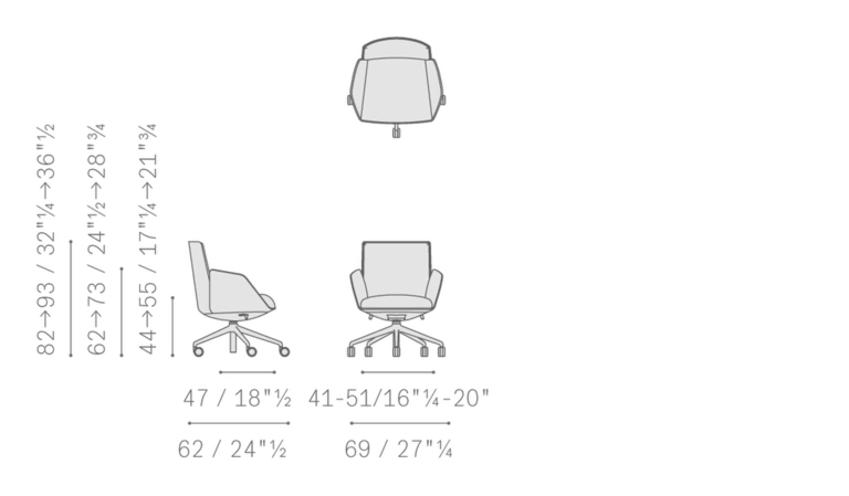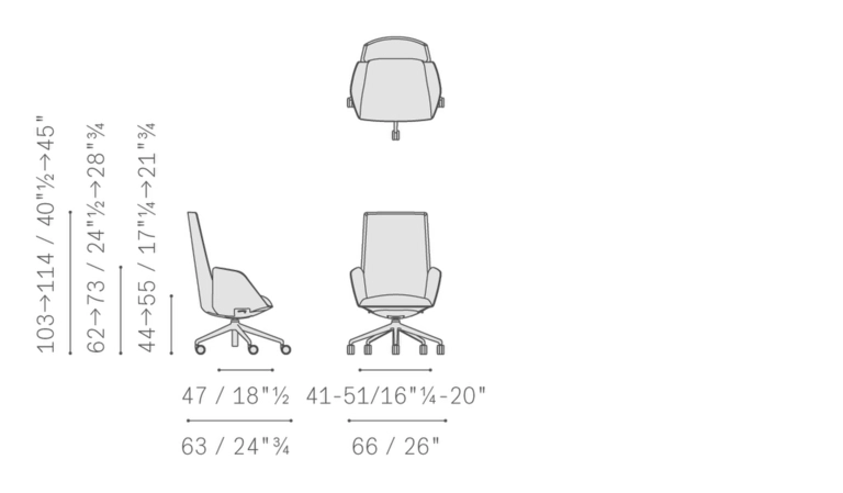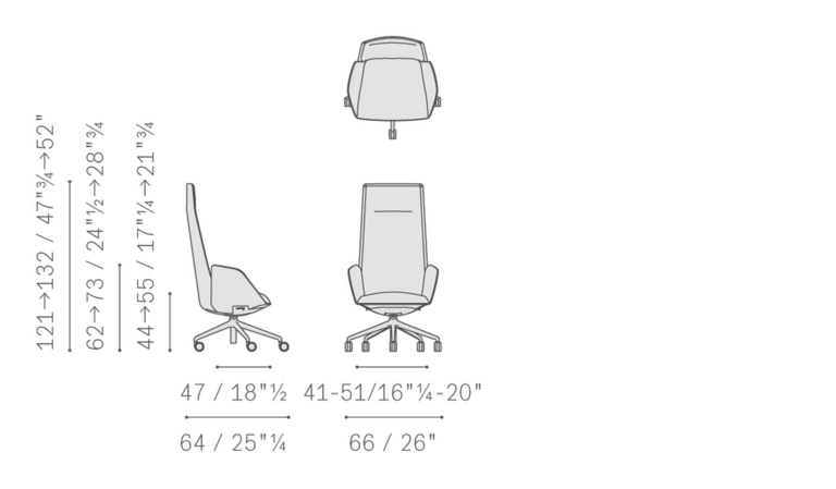 Конструкция из полиуретана с металлическими вставками гарантирует надежность, а обивка из кожи Cuoio Saddle Executive и Pelle Frau® добавляет роскоши. Основание кресла выполнено из полированного алюминия или черного лака с пятью спицами и газовой пружиной для легкой регулировки высоты. Ролики с автоматическим торможением обеспечивают безопасность на всех покрытиях.