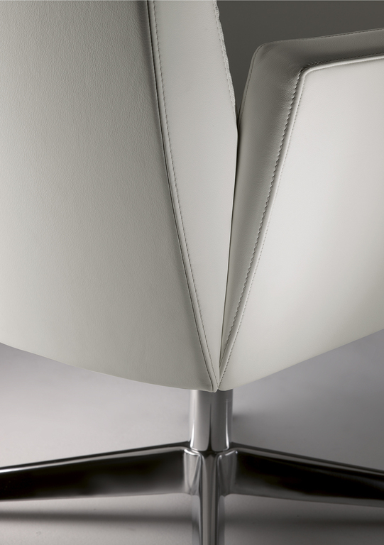 Кресло оснащено сложным поворотным механизмом, который обеспечивает легкость вращения. Четырехспицевое основание из прочной трубчатой стали доступно в хромированном или темно-сером лаке, что придает ему современный вид. Подлокотники, обитые кожей Pelle Frau®, добавляют нотки утонченности.