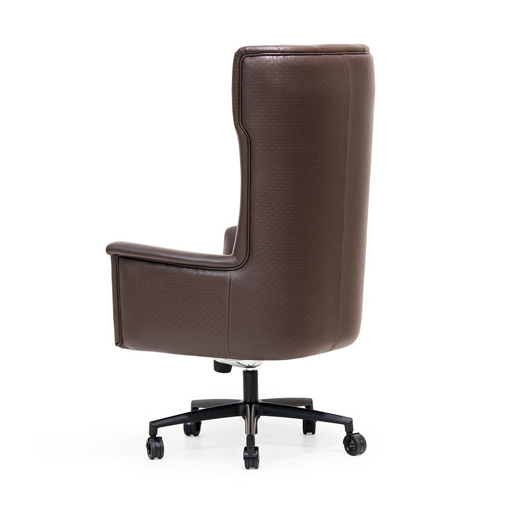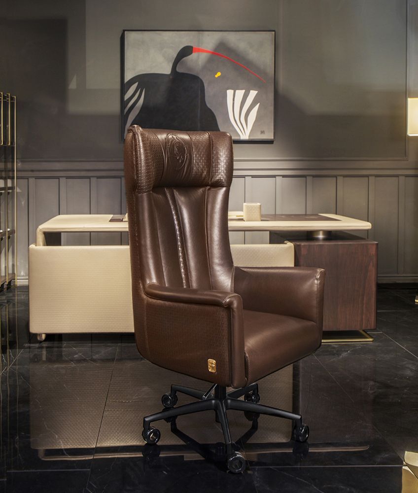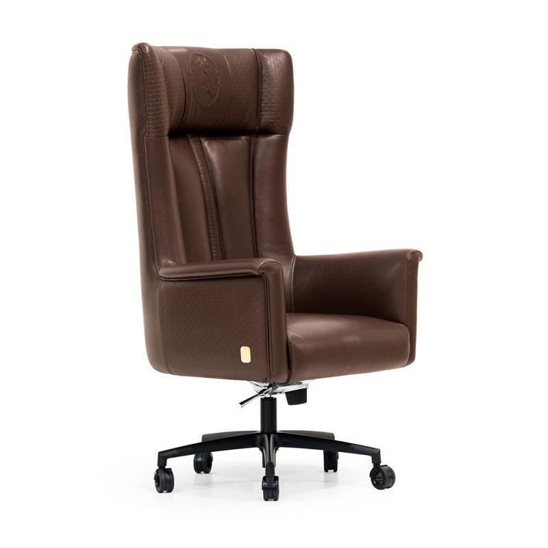Офисное кресло KOWLOON от итальянской фабрики FORMITALIA – воплощение элегантности и комфорта. Сиденье и спинка выполнены из кожи Daino каштанового оттенка с рельефной лошадью на подголовнике, что подчеркивает статусность модели. Поворотное основание матово-черного цвета дополнено внешней конструкцией и вставками из кожи с принтом «Маленький локон».