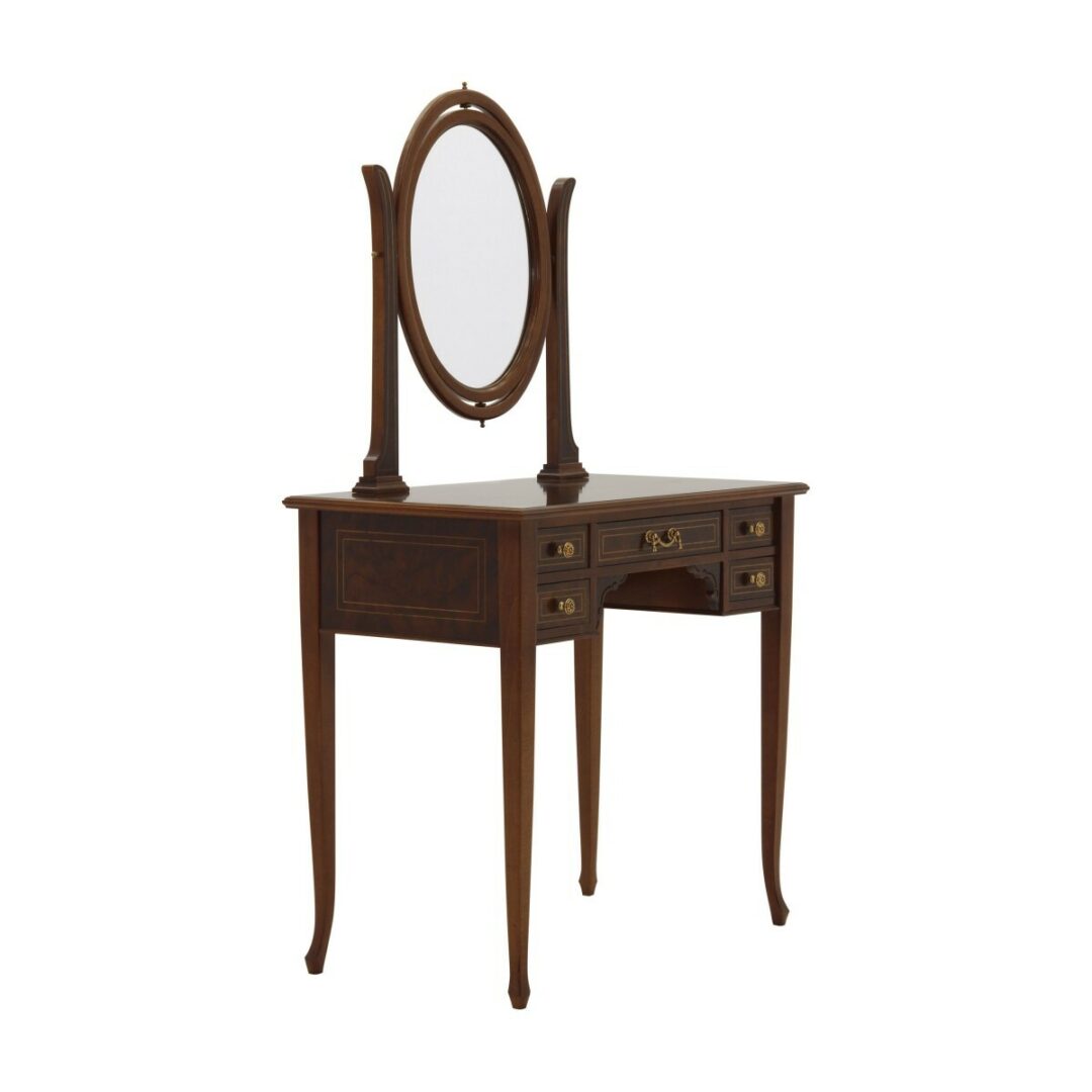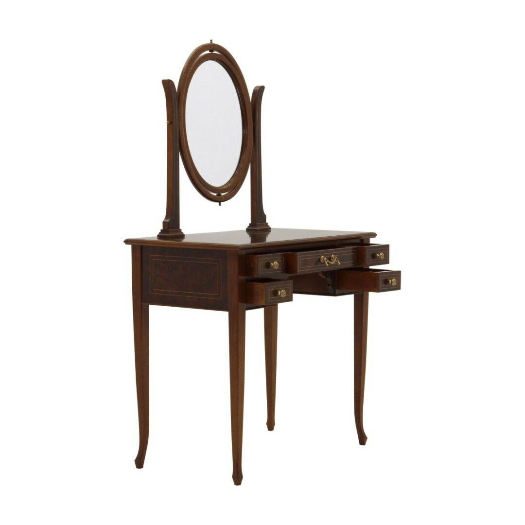 Стол оснащен откидывающимся зеркалом и пятью удобными ящиками, что делает его не только стильным, но и функциональным. Мы рекомендуем полированную отделку для достижения наилучшего эффекта.