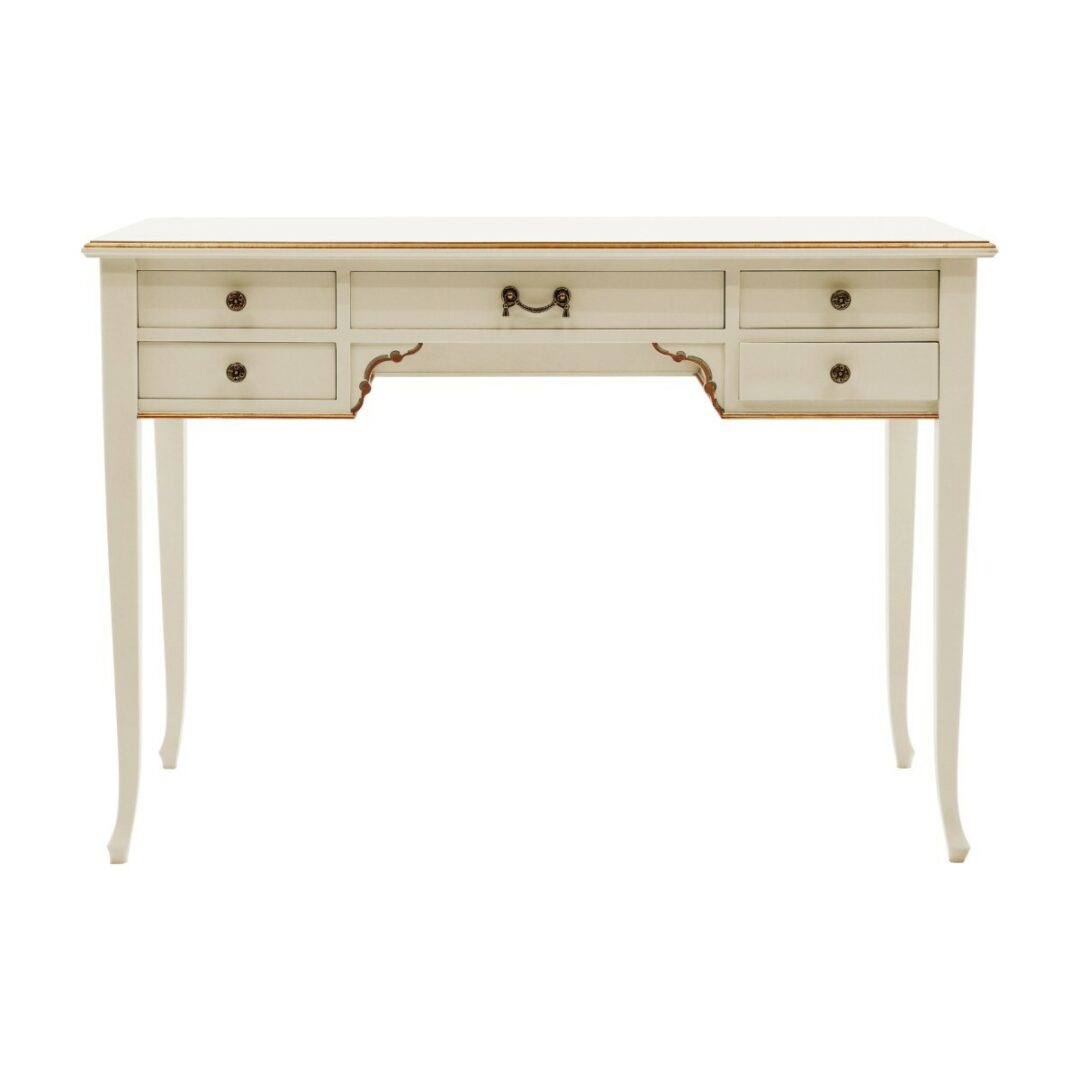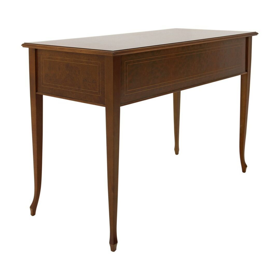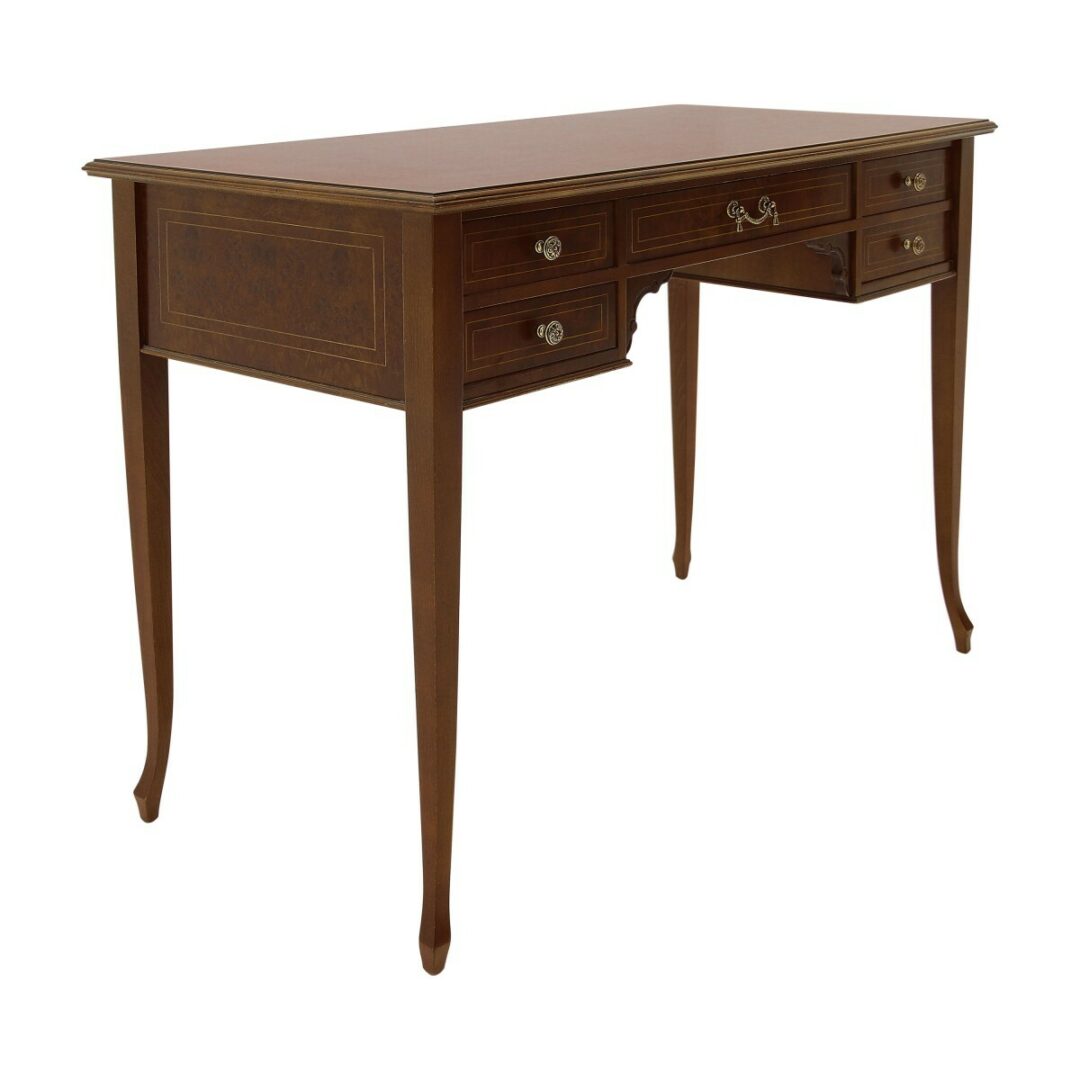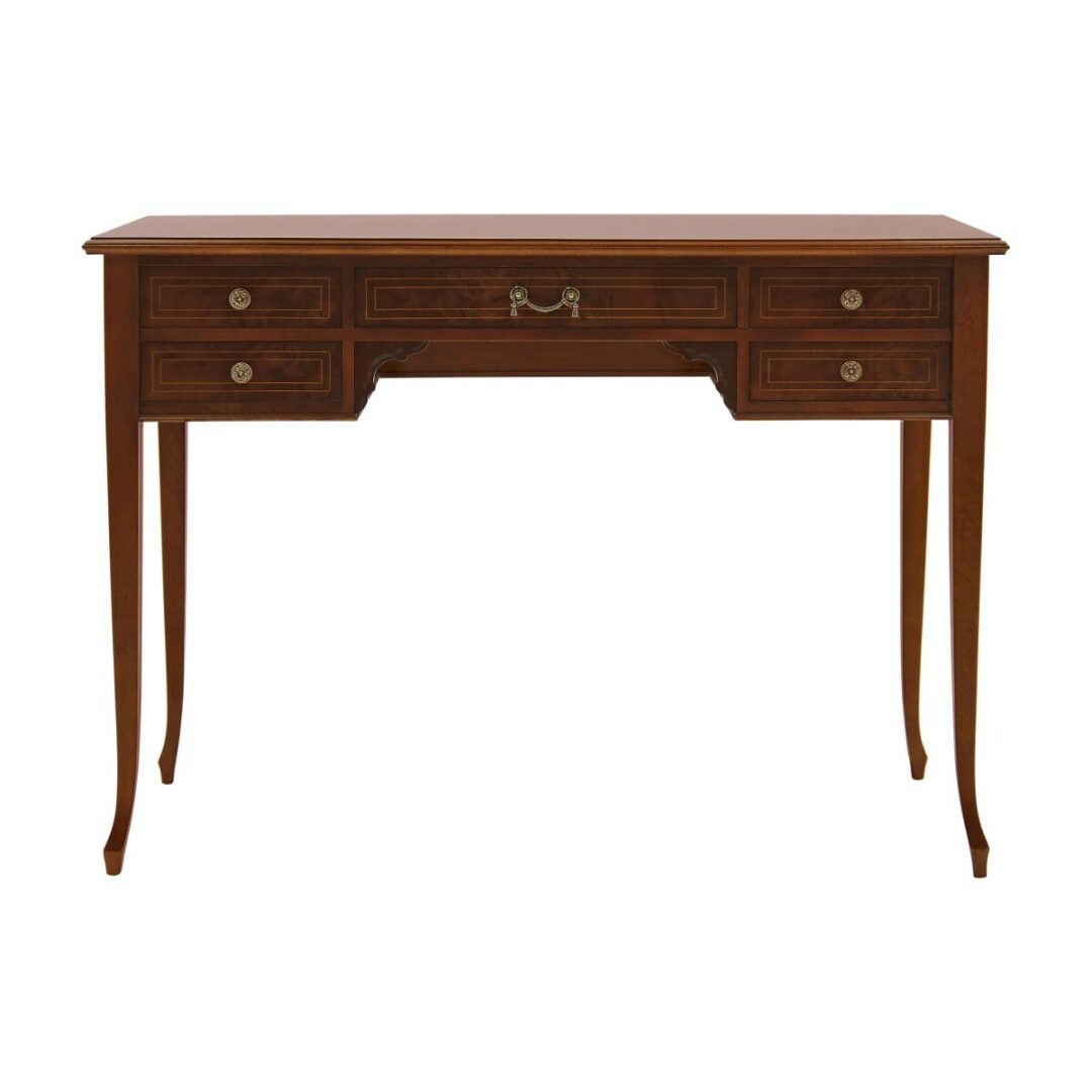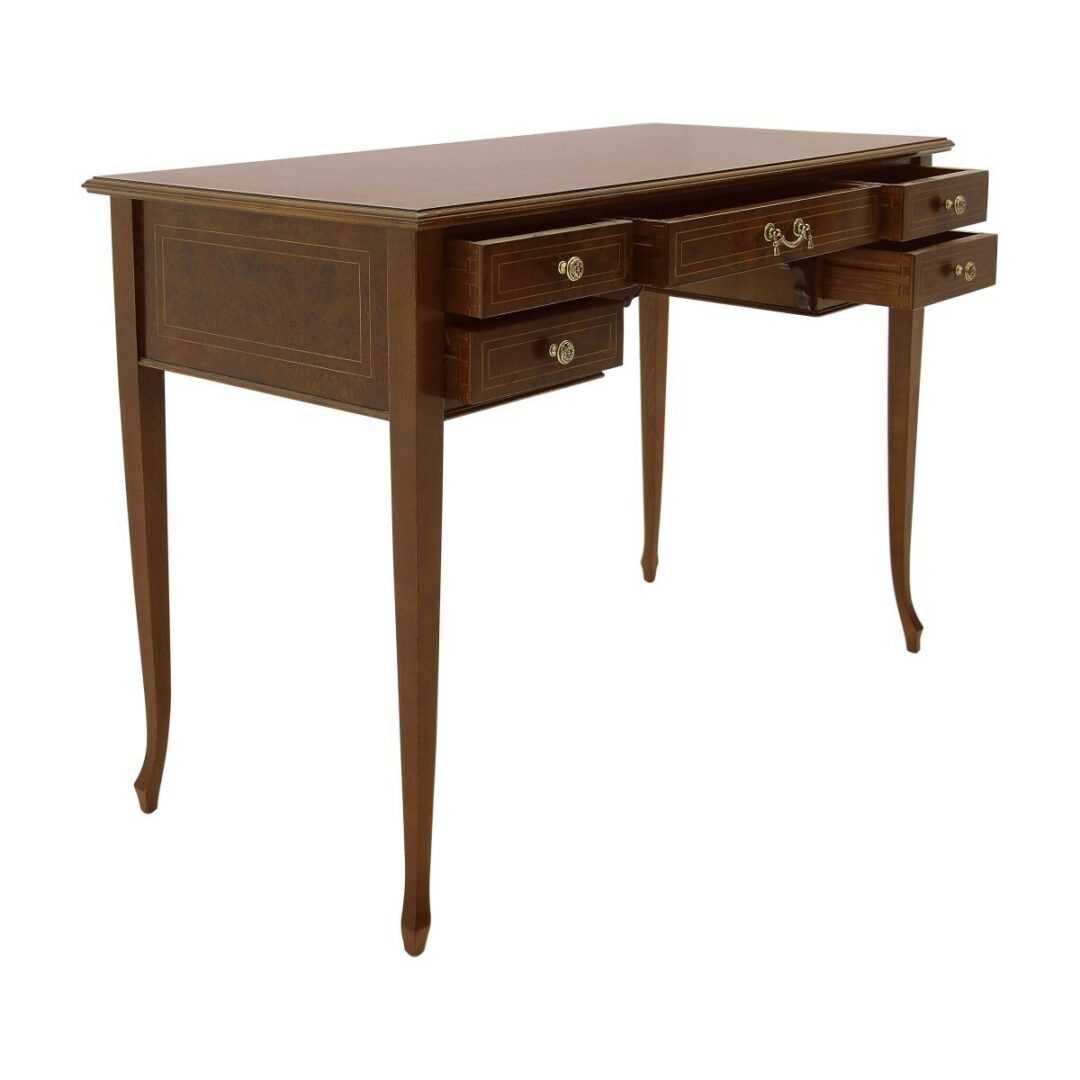 Стол оборудован пятью ящиками, обеспечивающими удобное хранение. Рекомендуемая полированная отделка подчеркивает его благородство и долговечность.
