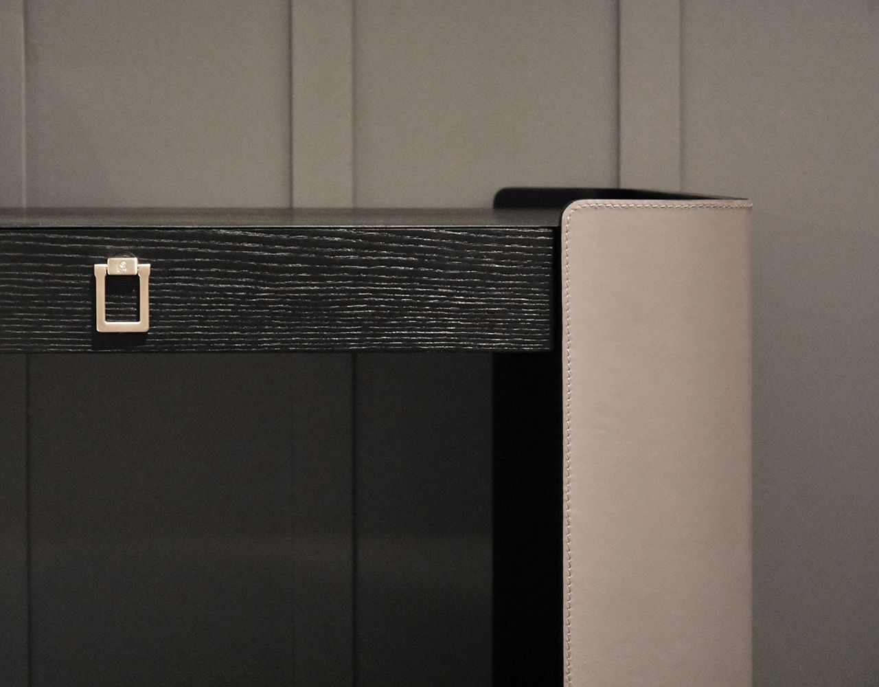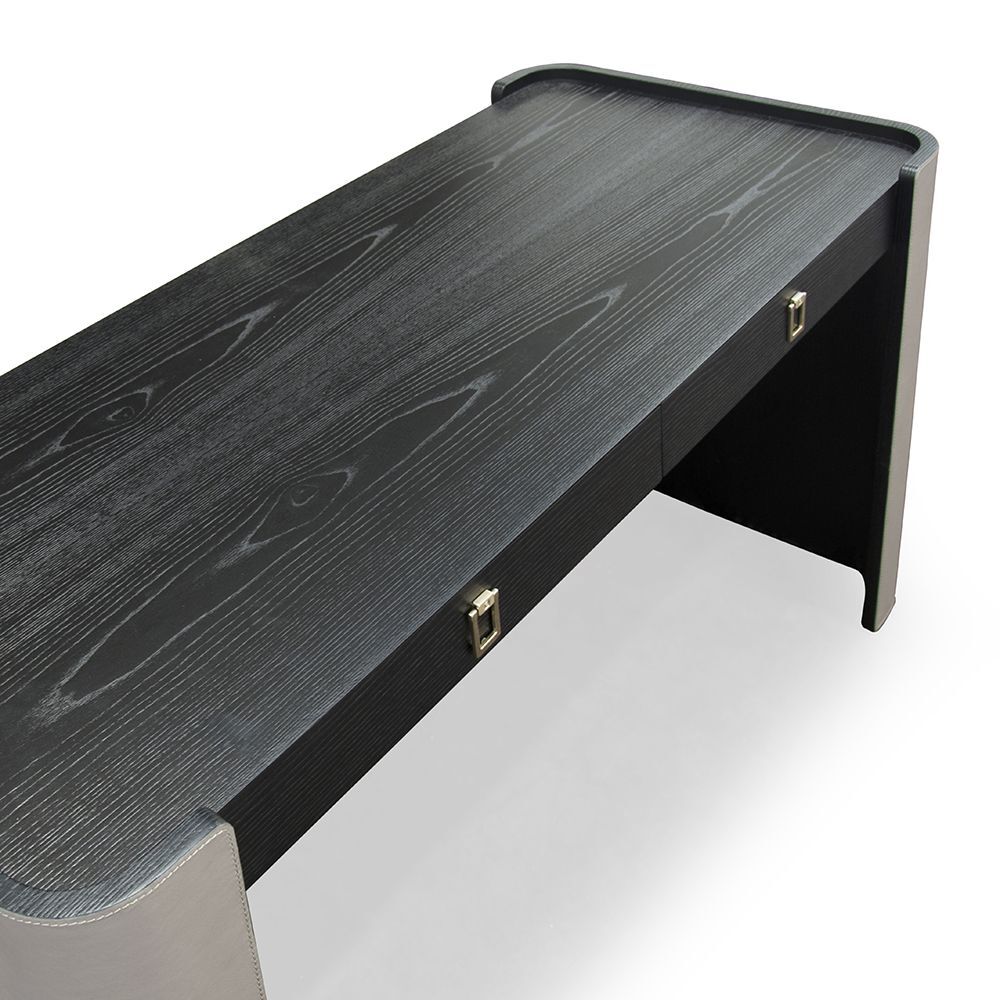 Письменный стол DOWNTOWN от итальянской фабрики FORMITALIA — воплощение элегантности и функциональности. Боковые стороны выполнены из кожи Daino королевского серого цвета с аккуратной строчкой тон в тон. Верхняя часть и фасады ящиков изготовлены из шпона ясеня с черными матовыми открытыми порами, а внутреннее пространство ящиков отделано черной микрофиброй. Ручки в виде стремени с золотистым атласным покрытием добавляют изысканности.