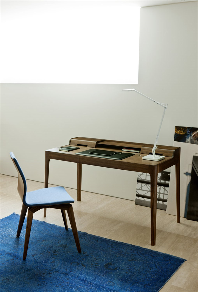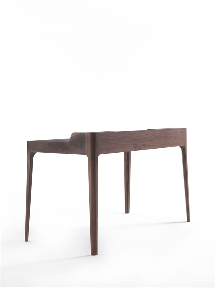 Элегантный стол выполнен из массива ореха каналетта и оснащен ящиком с отделениями для хранения. Инновационные скрытые направляющие для кабелей обеспечивают аккуратный вид рабочего пространства. Дополняет дизайн стильная подушка из кожи.