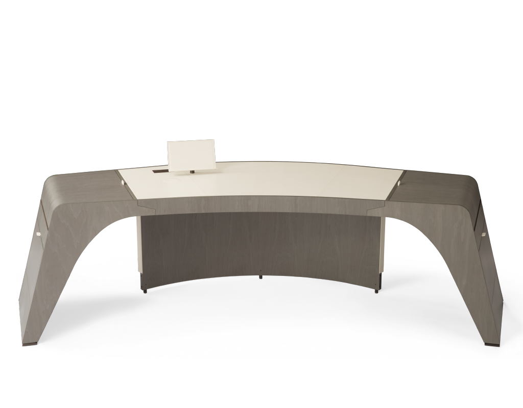 Письменный стол TENET выделяется своим представительным обликом и уникальными материалами. Он выполнен из высококачественного голубиного серого или шиферно-серого клена. Тщательно проработанные детали, такие как верх и ящики, покрыты роскошной кожаной обивкой и дополнены бронзовыми металлическими акцентами, подчеркивающими его элегантность. Размеры стола — 230 см в ширину, 101 см в глубину и 74 см в высоту — делают его идеальным для любого рабочего пространства, от домашнего кабинета до офисов премиум-класса.