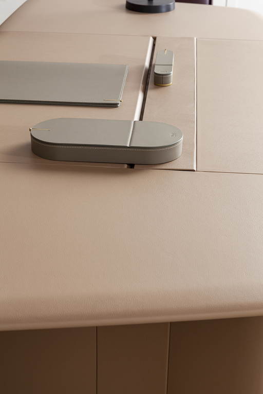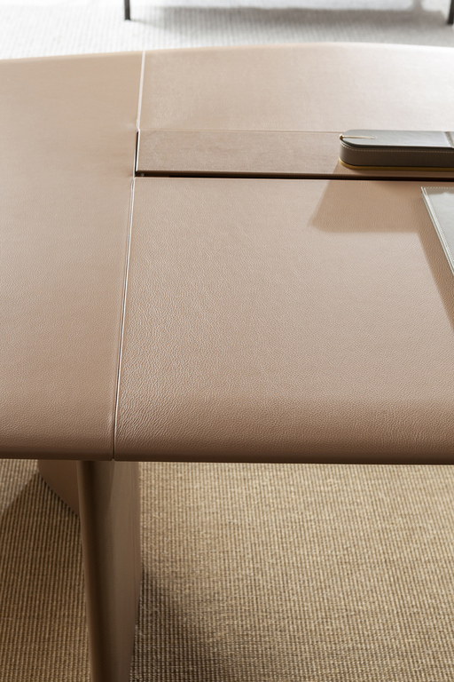 Каждый стол изготавливается с использованием только самых высококачественных материалов. Вы можете выбрать отделку из седельной кожи или техно-дерева, что придаст вашему столу элегантный и современный вид. Столешница и ноги, обитые кожей, создают единое целое, подчеркивая деликатность и уникальность каждого изделия.