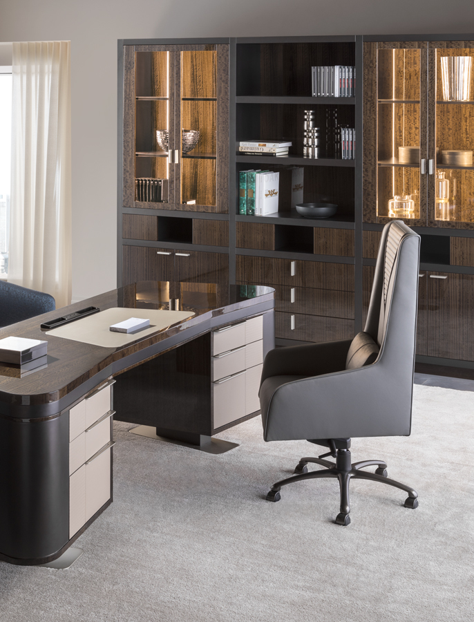 Письменный стол VG910 от итальянской фабрики MEDEA — элегантное сочетание матового лака и натурального дерева. Изысканный дизайн с продуманными деталями подчеркивает статус интерьера, а качественные материалы гарантируют долговечность.