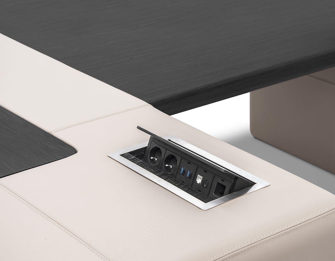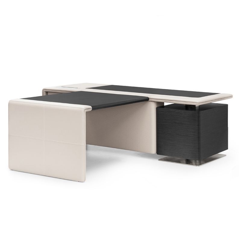 Письменный стол YANGOON от итальянской фабрики FORMITALIA – элегантное решение для рабочего пространства. Верхняя рама и ножки выполнены из искусственной кожи Kobe col 5002 с принтом «Маленький локон» и аккуратными стежками в тон. Рабочая поверхность и выдвижные ящики изготовлены из черного шпона с матовой открыто-пористой отделкой, что подчеркивает премиальное качество.