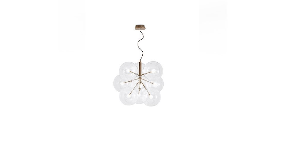 Светильник Bolle Cielo напоминает парящие в воздухе сферы, создавая эффект легкости и динамики. Композиция из 6 или 9 стеклянных «мячей» разного диаметра формирует объемный и в то же время воздушный силуэт. Такой дизайн идеально впишется в современные интерьеры, будь то просторная гостиная, элегантная столовая или респектабельный офис. Игра преломленного света добавляет помещению глубины и тепла, превращая обычное освещение в центральный элемент декора.