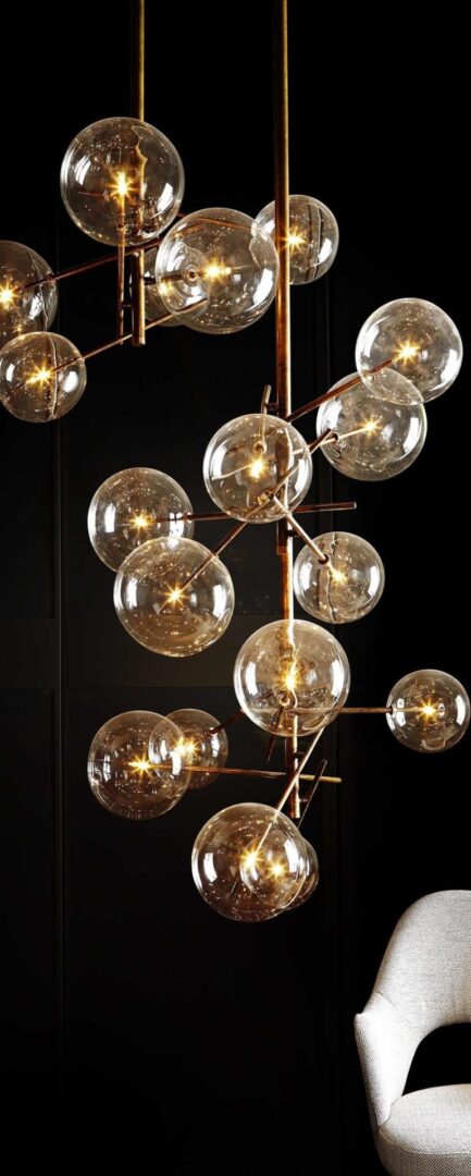 Каждый шар тщательно размещен, чтобы свет мягко рассеивался, подчеркивая фактуру материалов и создавая уютную атмосферу.