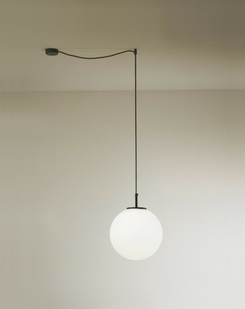 Светильник оснащен регулируемой подвеской на электрическом тросе, что позволяет адаптировать его под любые условия. Рассеиватель из натурального выдувного стекла создает мягкий свет, а использование стальных и латунных элементов гарантирует долговечность.