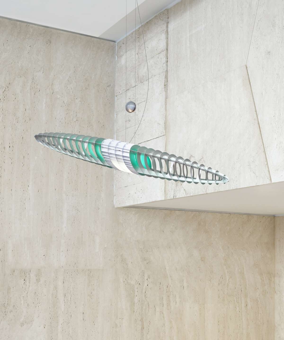 Подвесной светильник Queen Titania от итальянской фабрики Luceplan — премиальное решение для освещения просторных интерьеров. Увеличенный размер создаёт выразительный визуальный эффект, а уникальная система сменных фильтров позволяет менять цвет алюминиевого корпуса, сохраняя чистоту белого света.