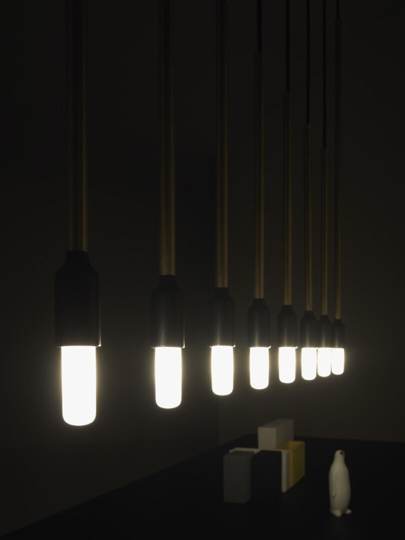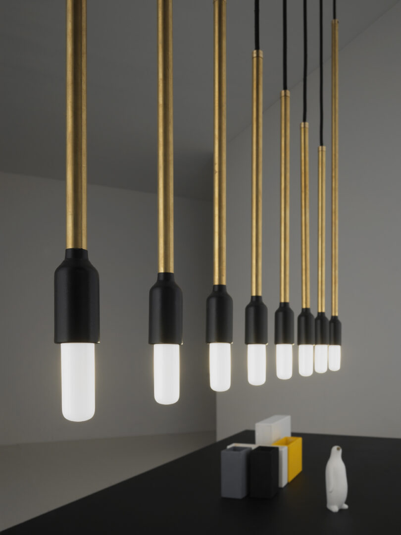 Светильник T-25 отличается строгой геометрией и изысканной простотой. Его цилиндрическая форма с диаметром всего 3,5 см создает впечатление легкости и воздушности, а разнообразие высот (от 47 до 152 см) позволяет подобрать идеальный вариант для любого пространства. Длинный кабель (до 350 см в некоторых моделях) обеспечивает гибкость в размещении, будь то обеденная зона, гостиная или кабинет. Декоративные версии светильника добавляют интерьеру нотку изысканности, подчеркивая статус владельца.
